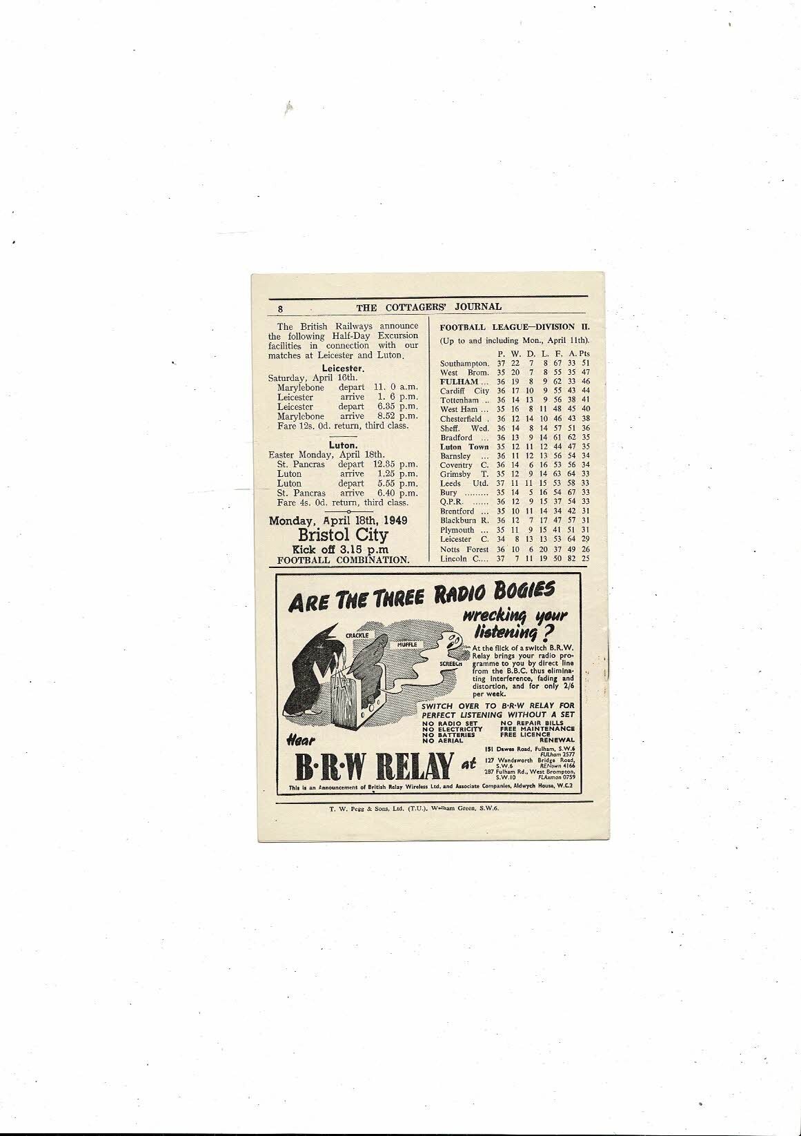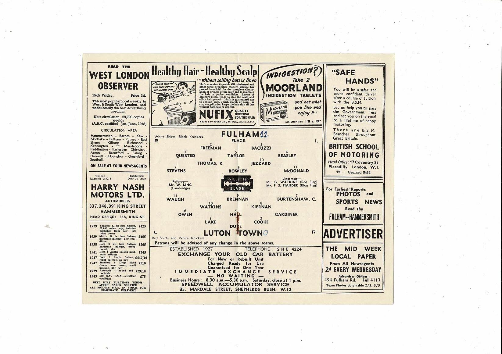 1948/49 Fulham v Luton Town Football Programme