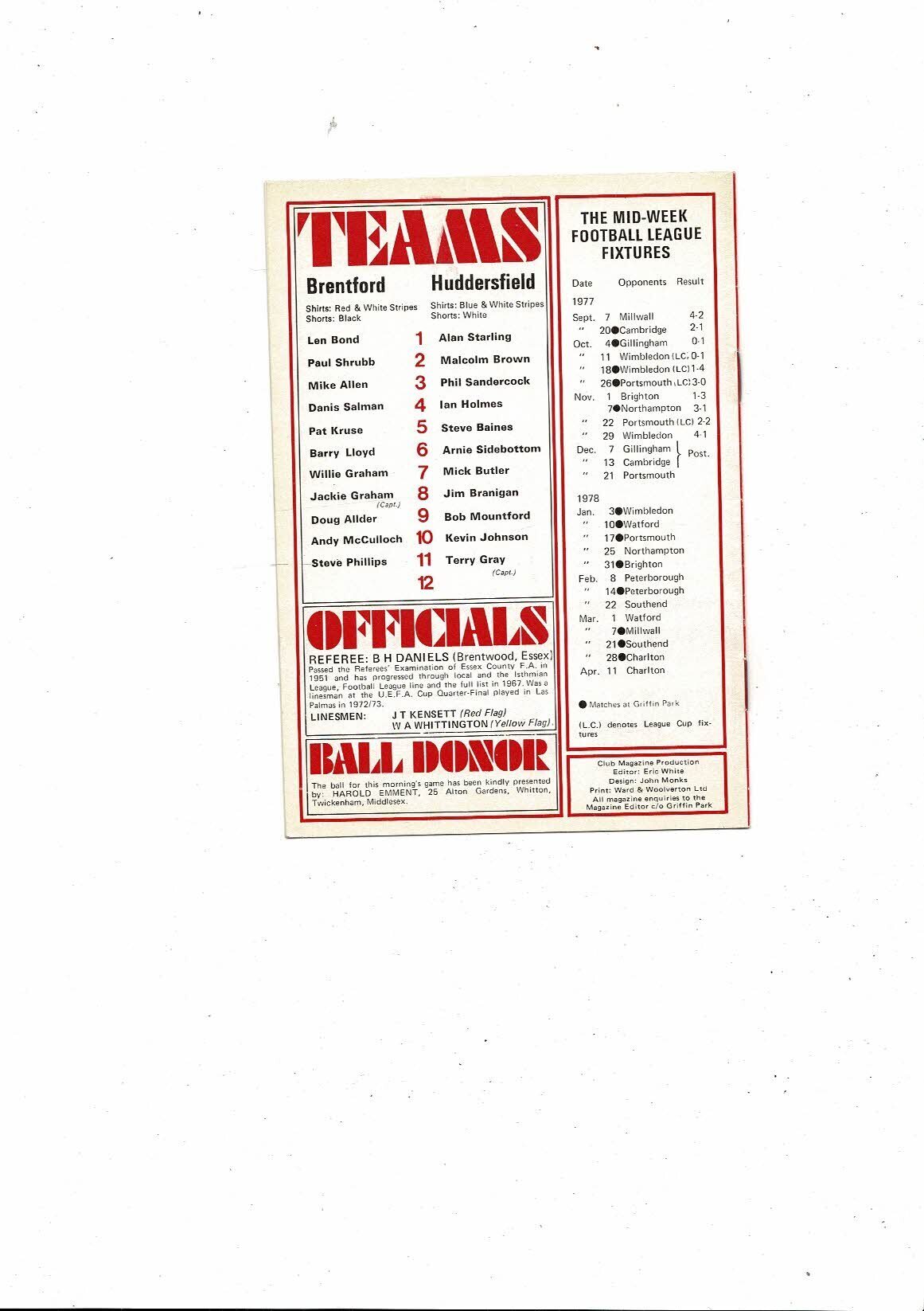 1977/78 Brentford v Huddersfield Town Football Programme