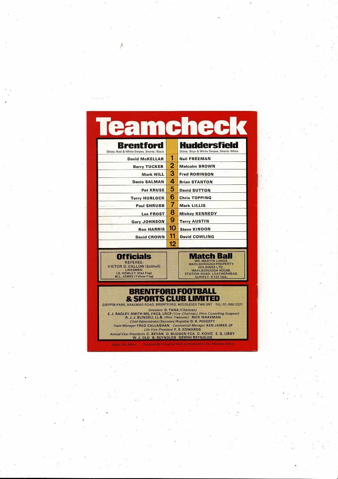 1980/81 Brentford v Huddersfield Town Football Programme