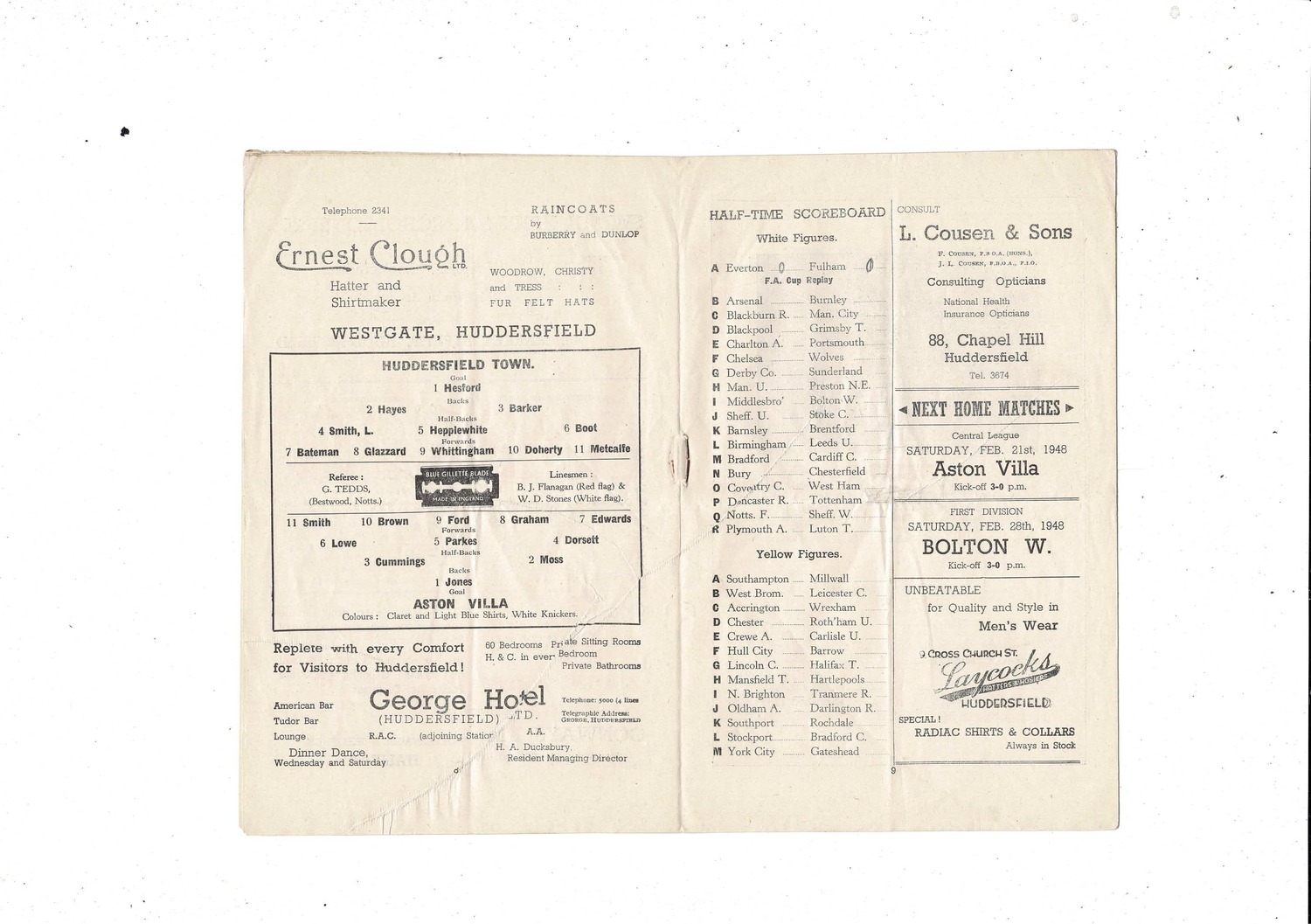 1947/48 Huddersfield Town v Aston Villa Football Programme