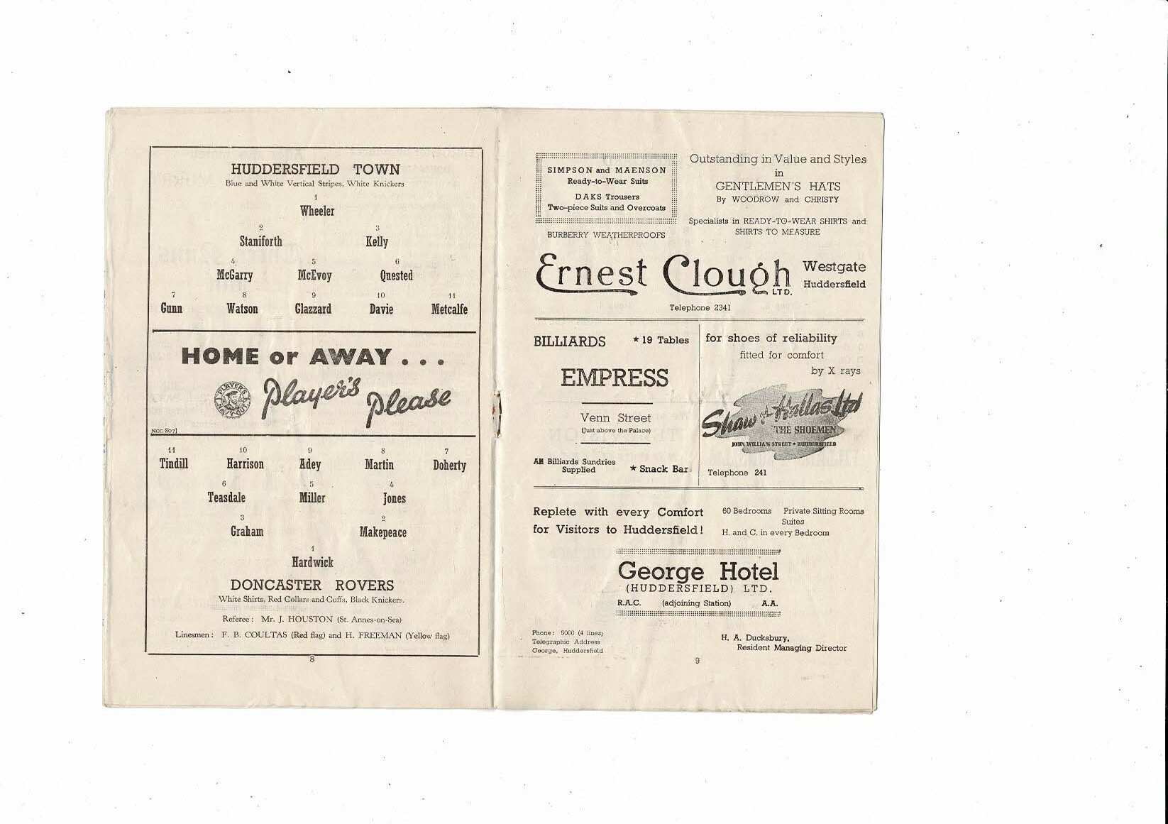 1952/53 Huddersfield Town v Doncaster Rovers Football Programme