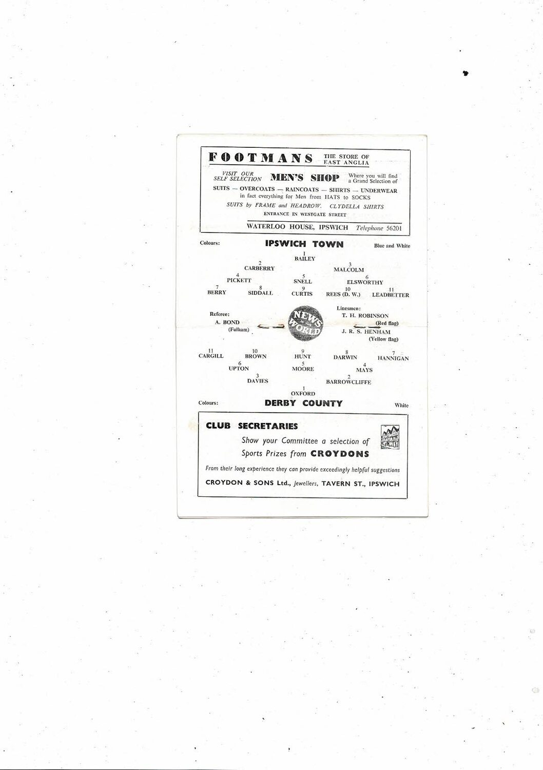 1958/59 Ipswich Town v Derby County Football Programme