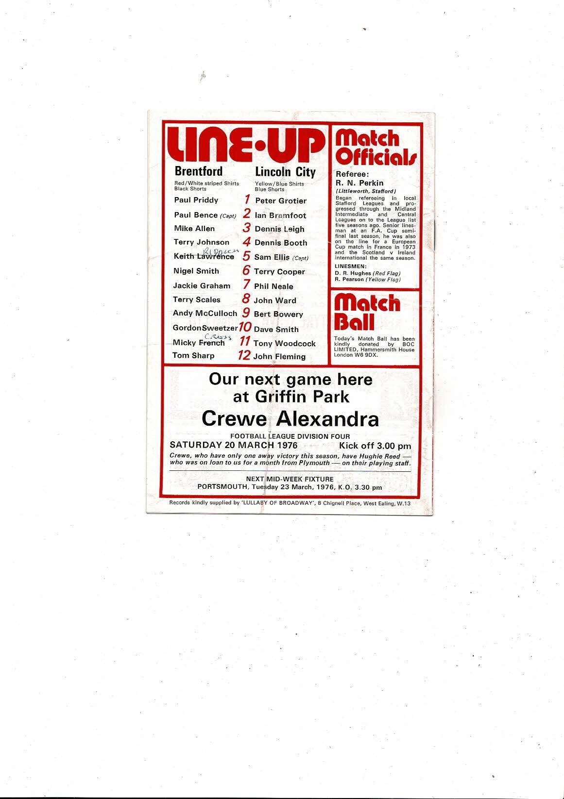 1975/76 Brentford v Lincoln City Football Programme