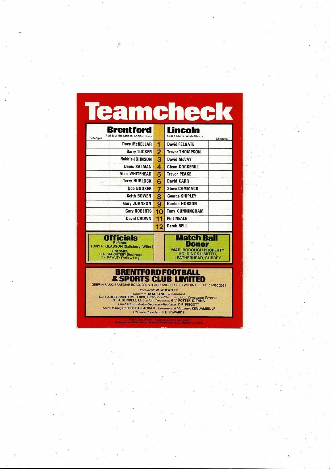 1981/82 Brentford v Lincoln Football Programme