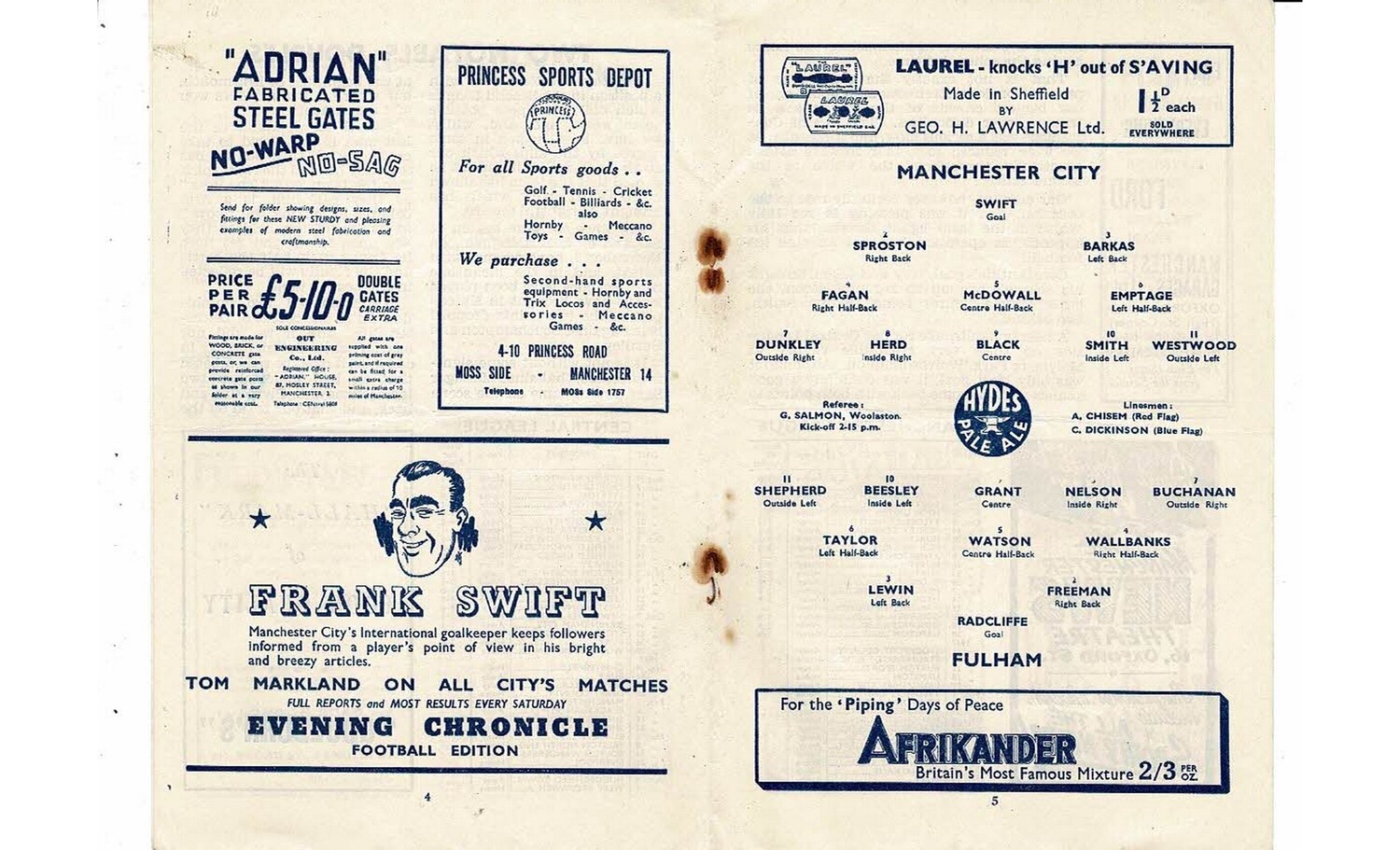 1946/47 Manchester City v Fulham Football Programme