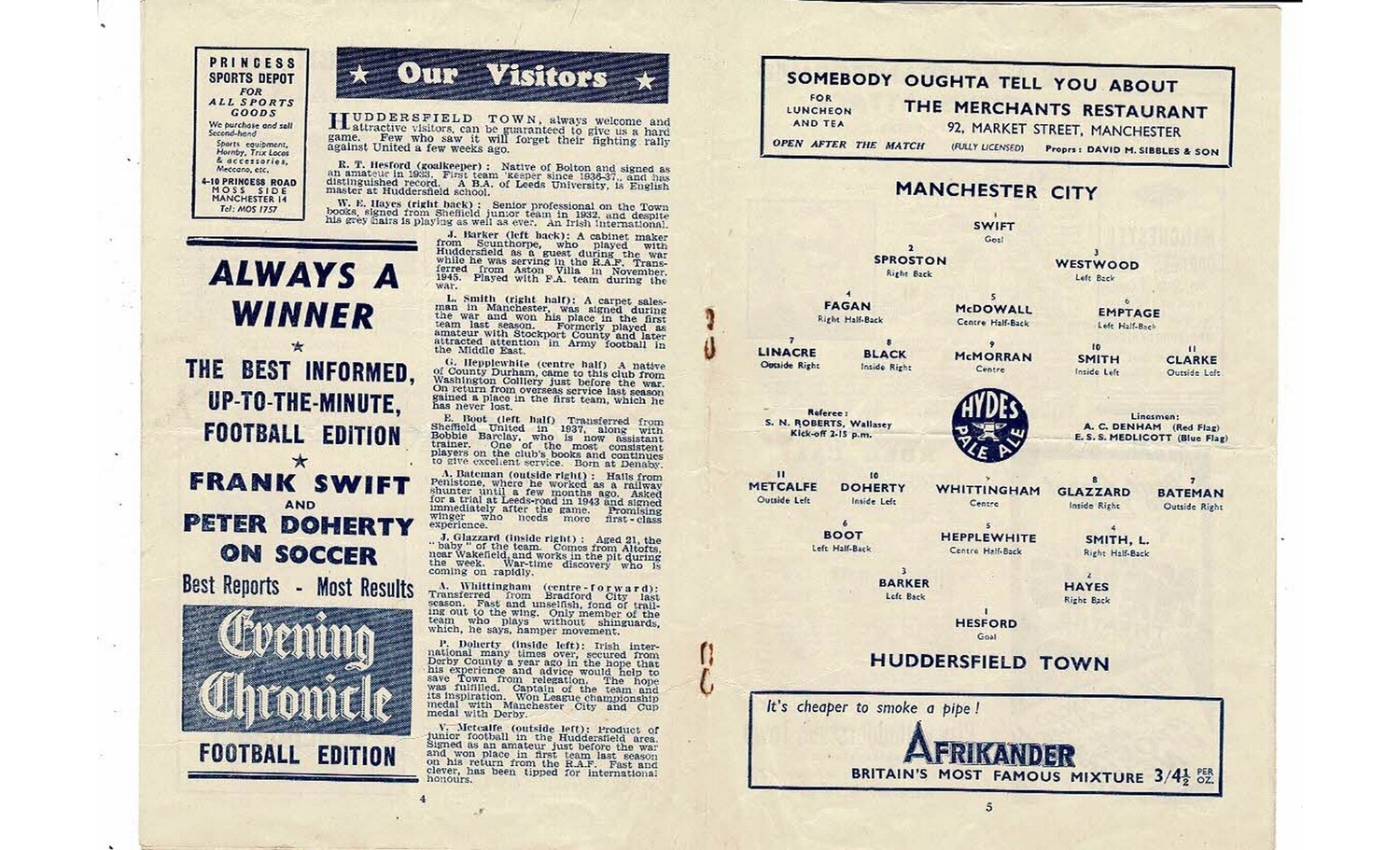 1947/48 Manchester City v Huddersfield Town Football Programme