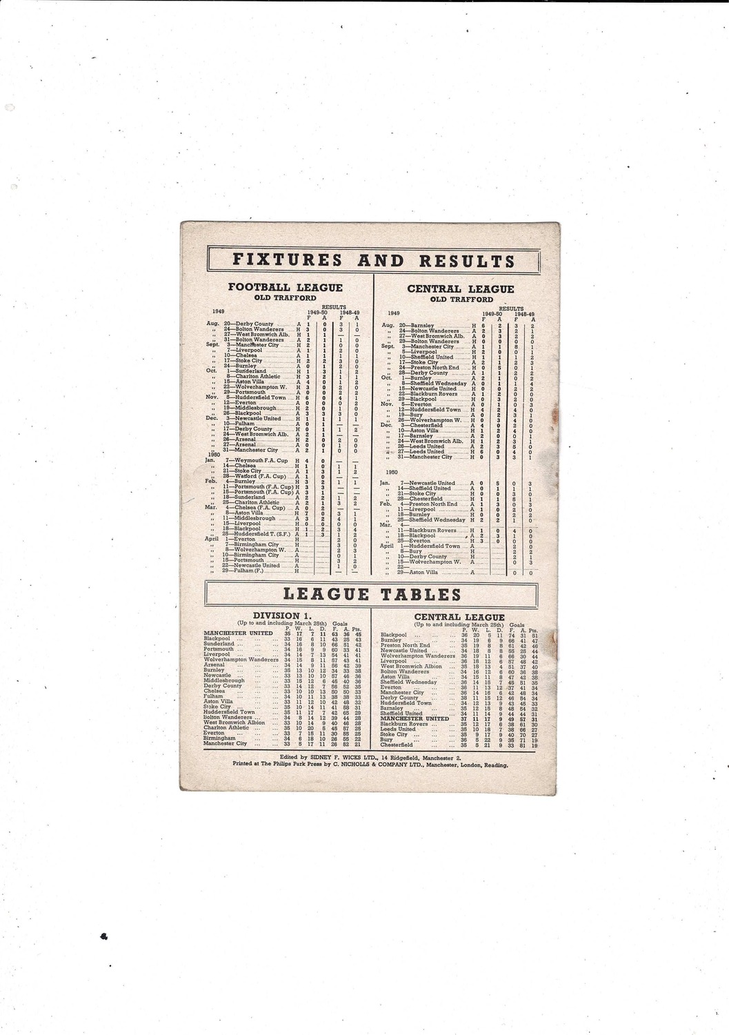 1949/50 Manchester United v Everton Football Programme