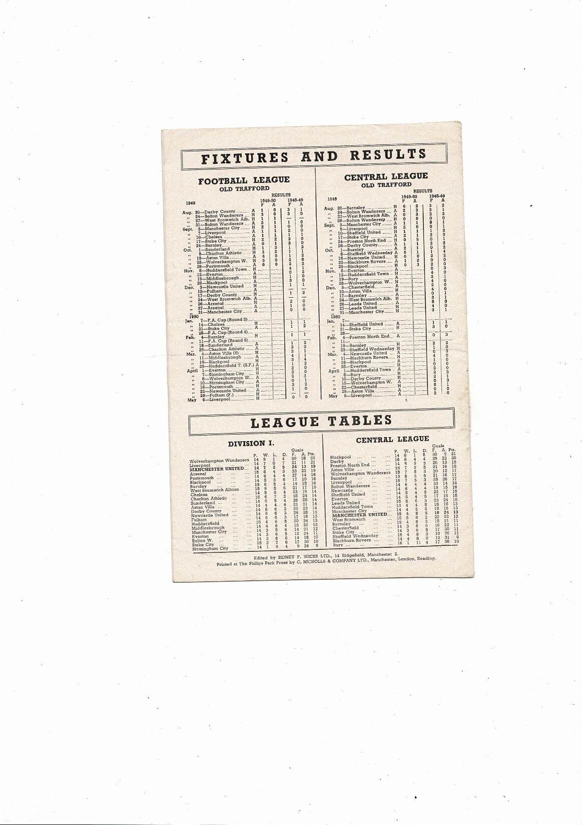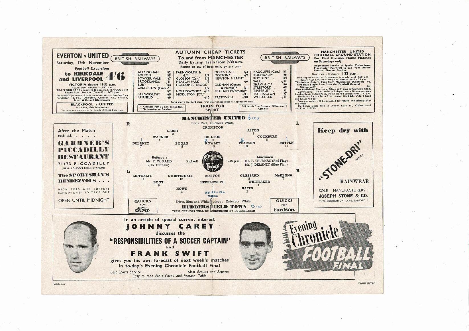 1949/50 Manchester United v Huddersfield Town Football Programme