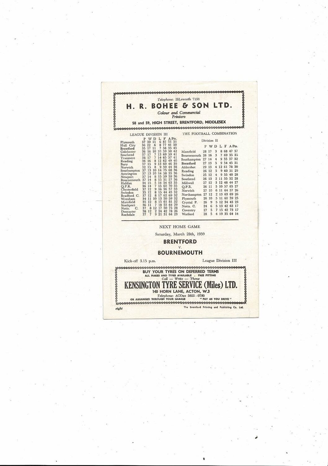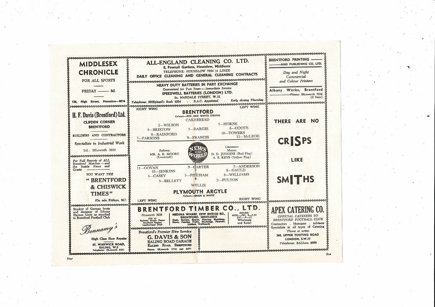 1958/59 Brentford v Plymouth Argyle Football Programme