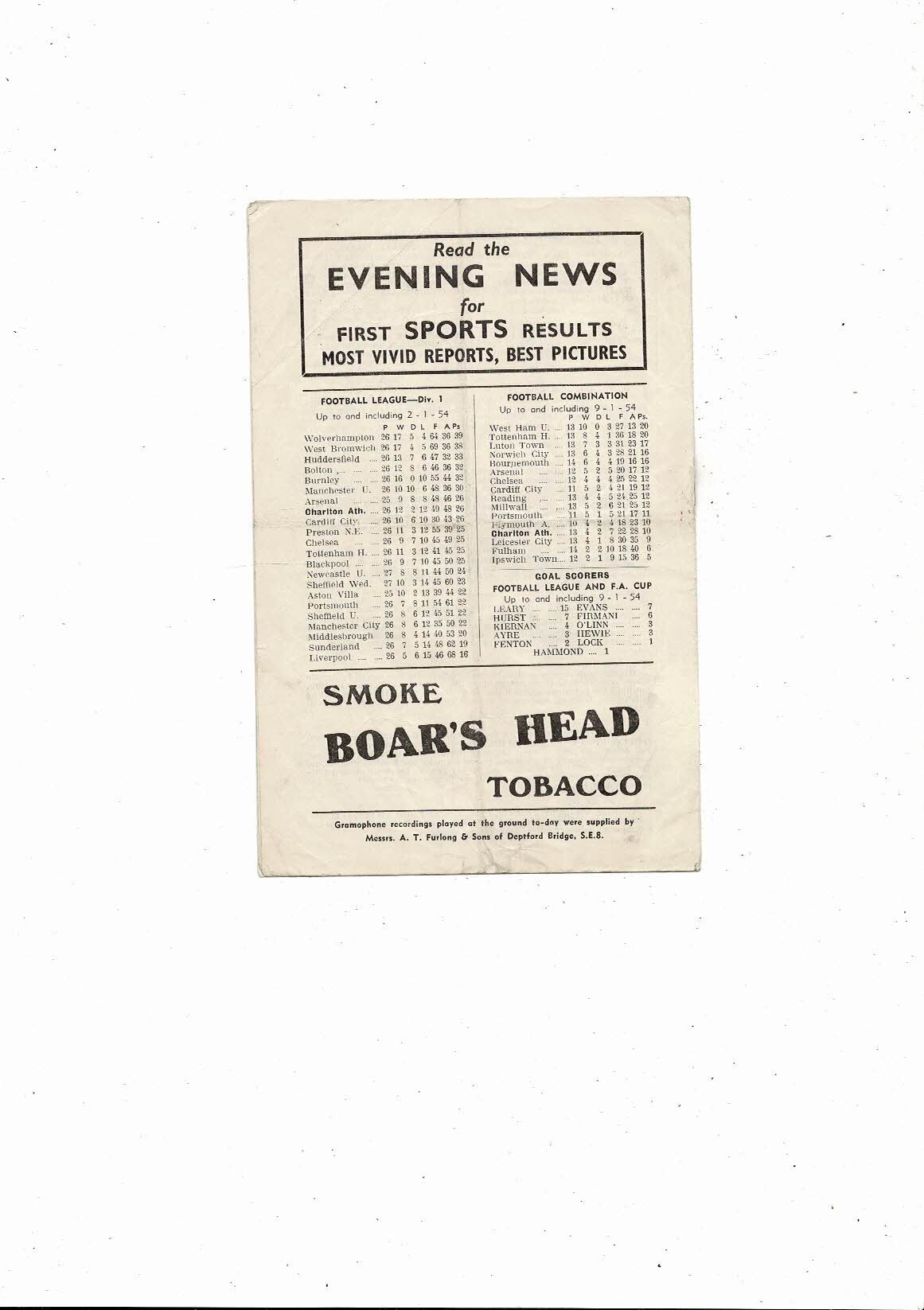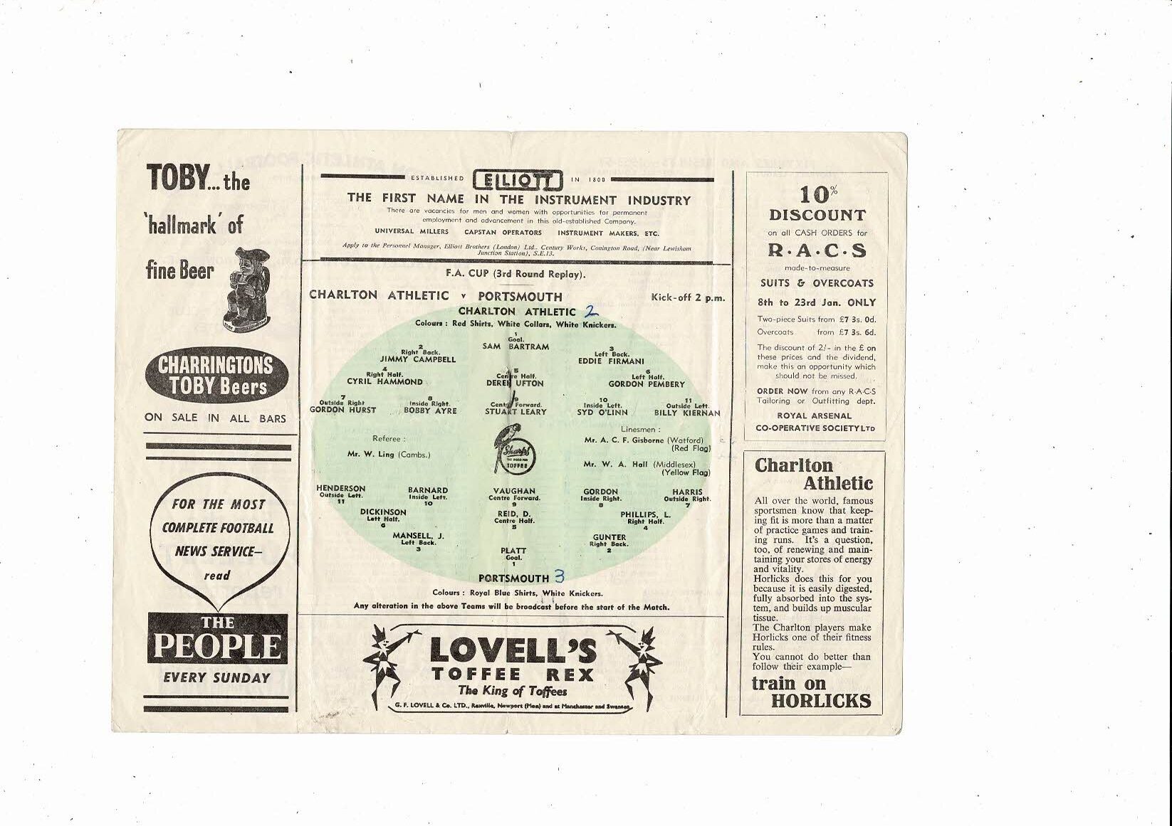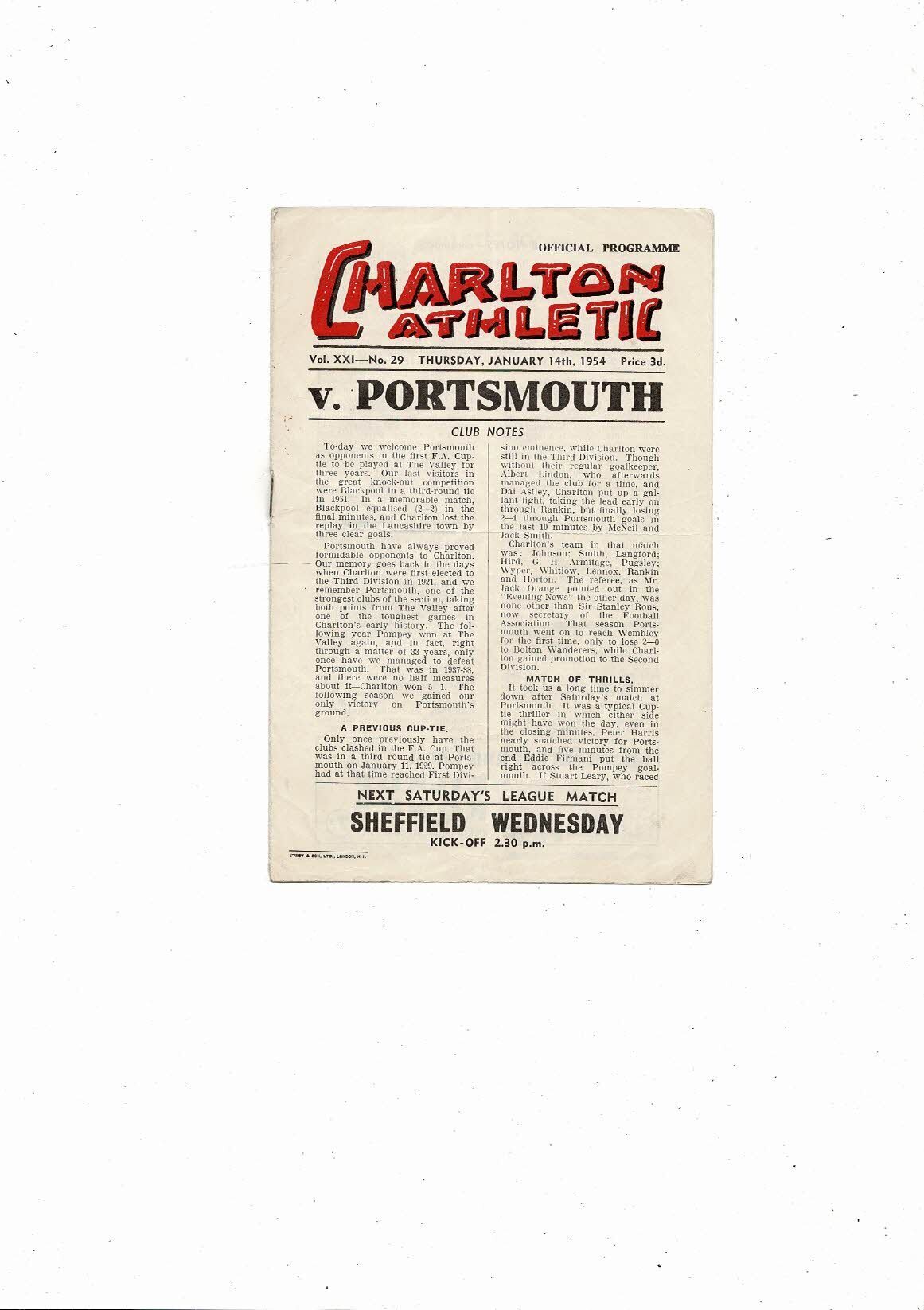 1953/54 Charlton Athletic v Portsmouth FA Cup Replay Football Programme