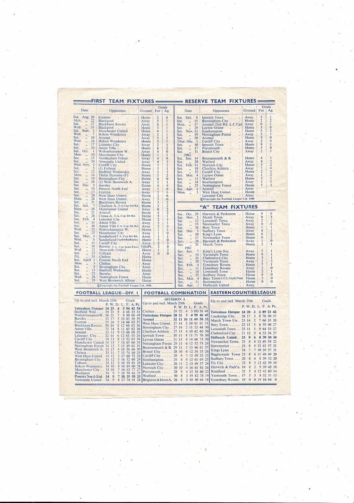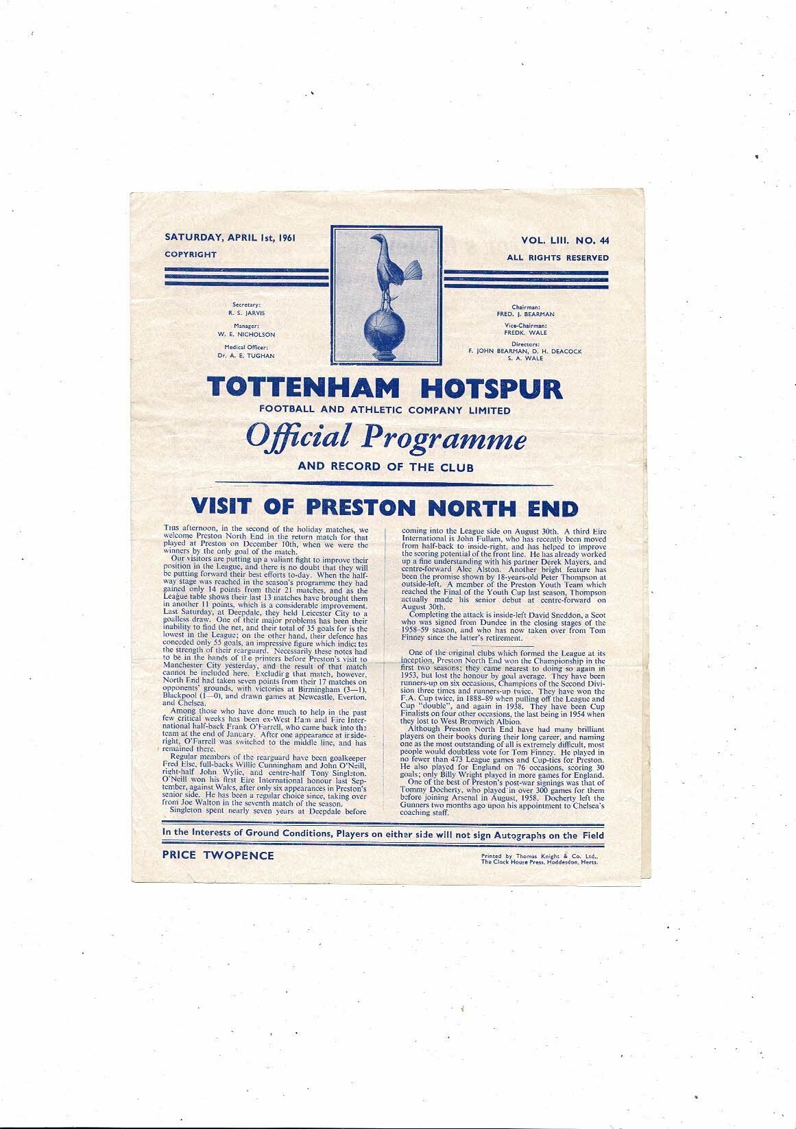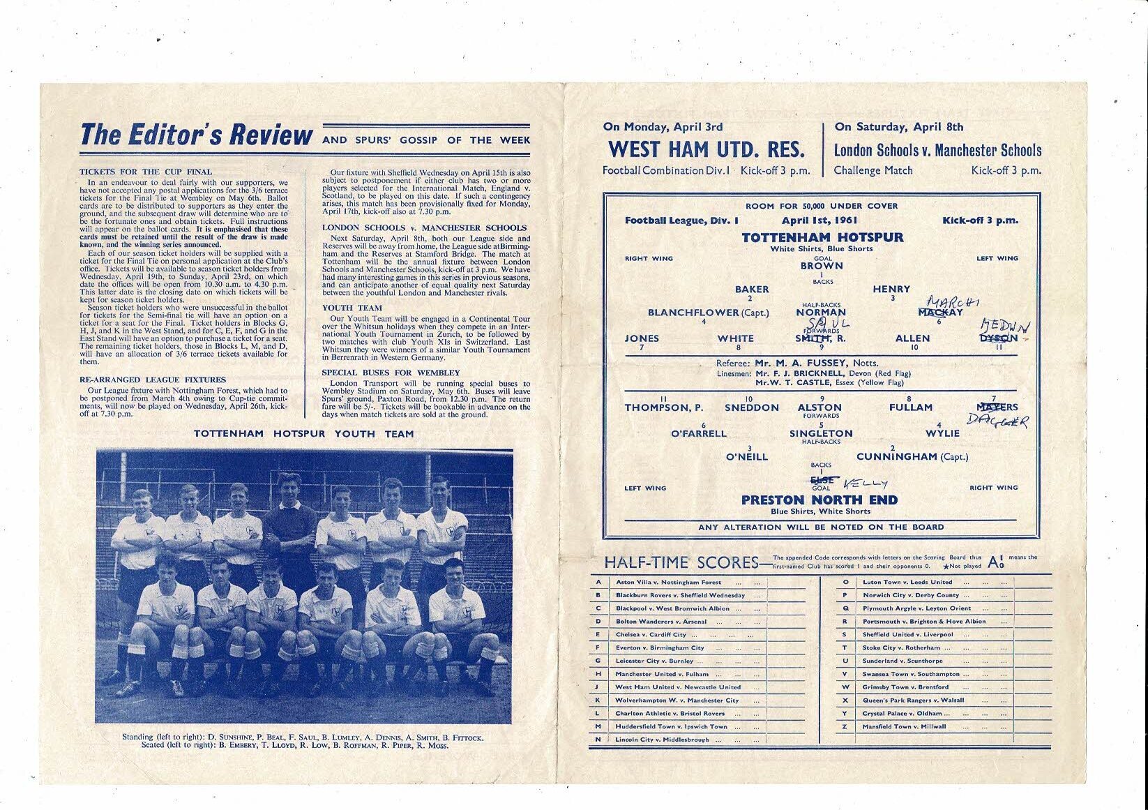 1960/61 Tottenham Hotspur v Preston Football Programme