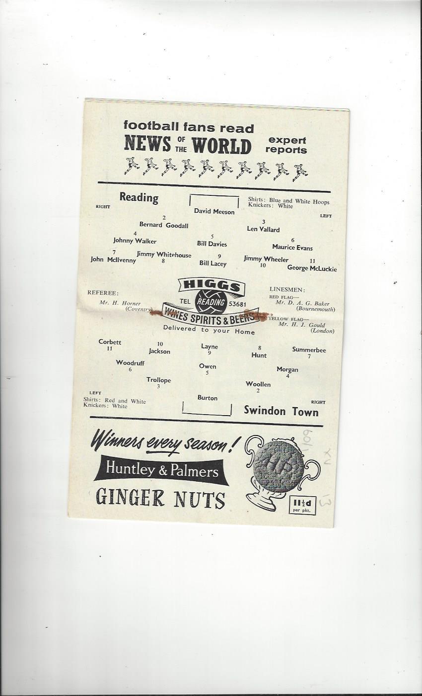 1960/61 Reading v Swindon Town Football Programme
