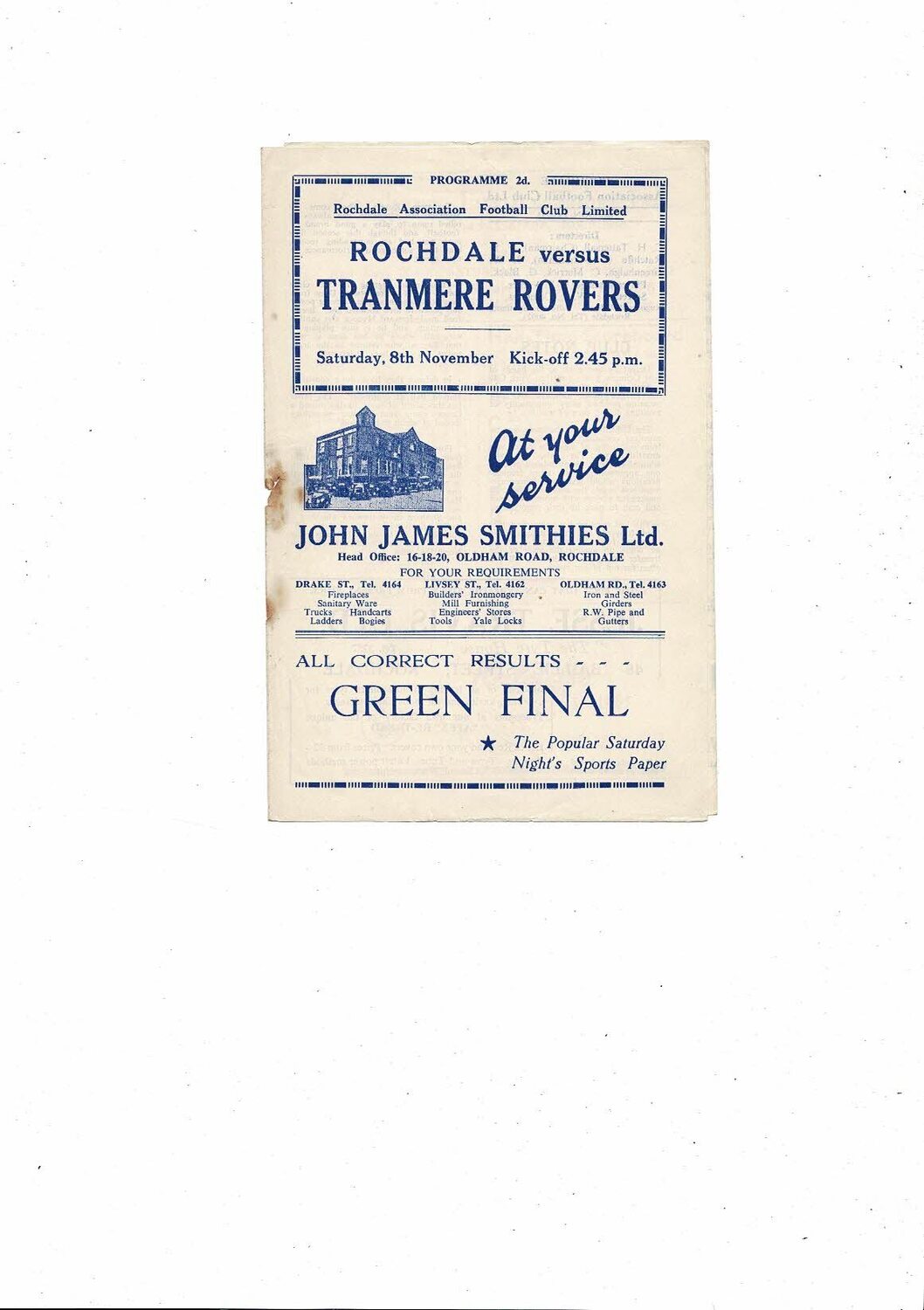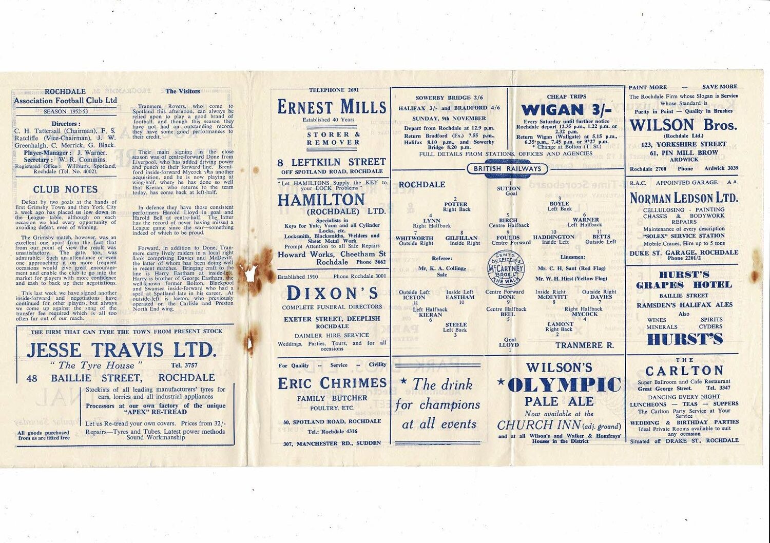 1952/53 Rochdale v Tranmere Rovers Football Programme