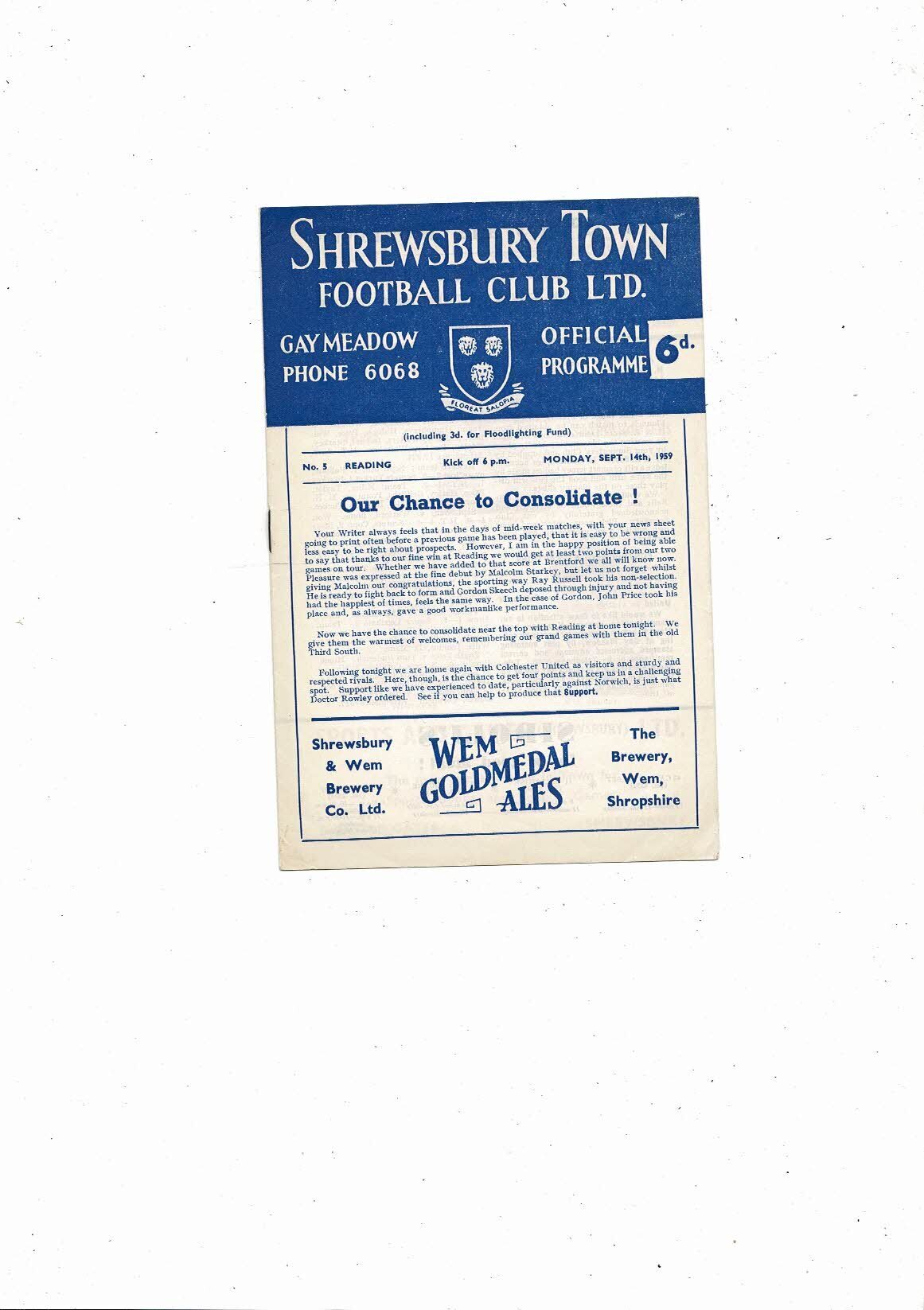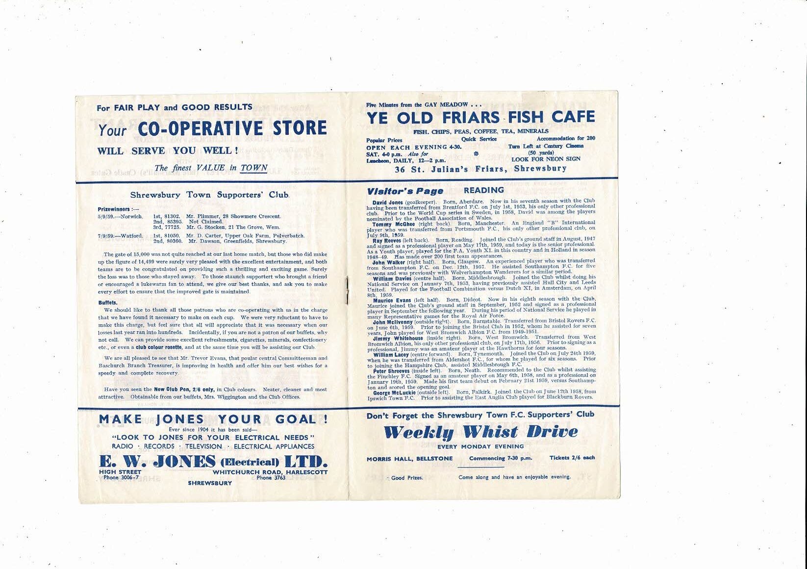 1959/60 Shrewsbury Town v Reading Football Programme