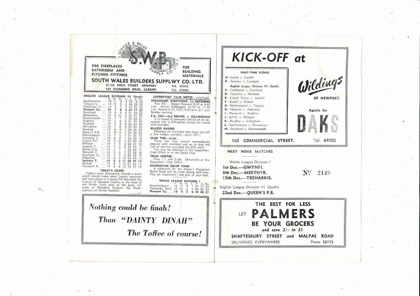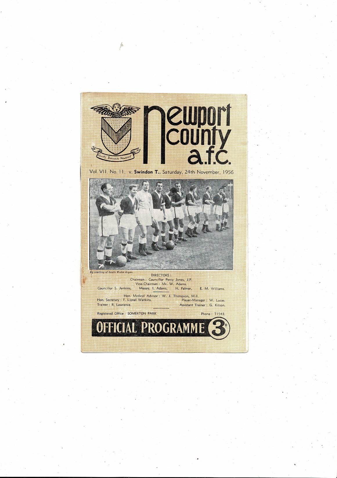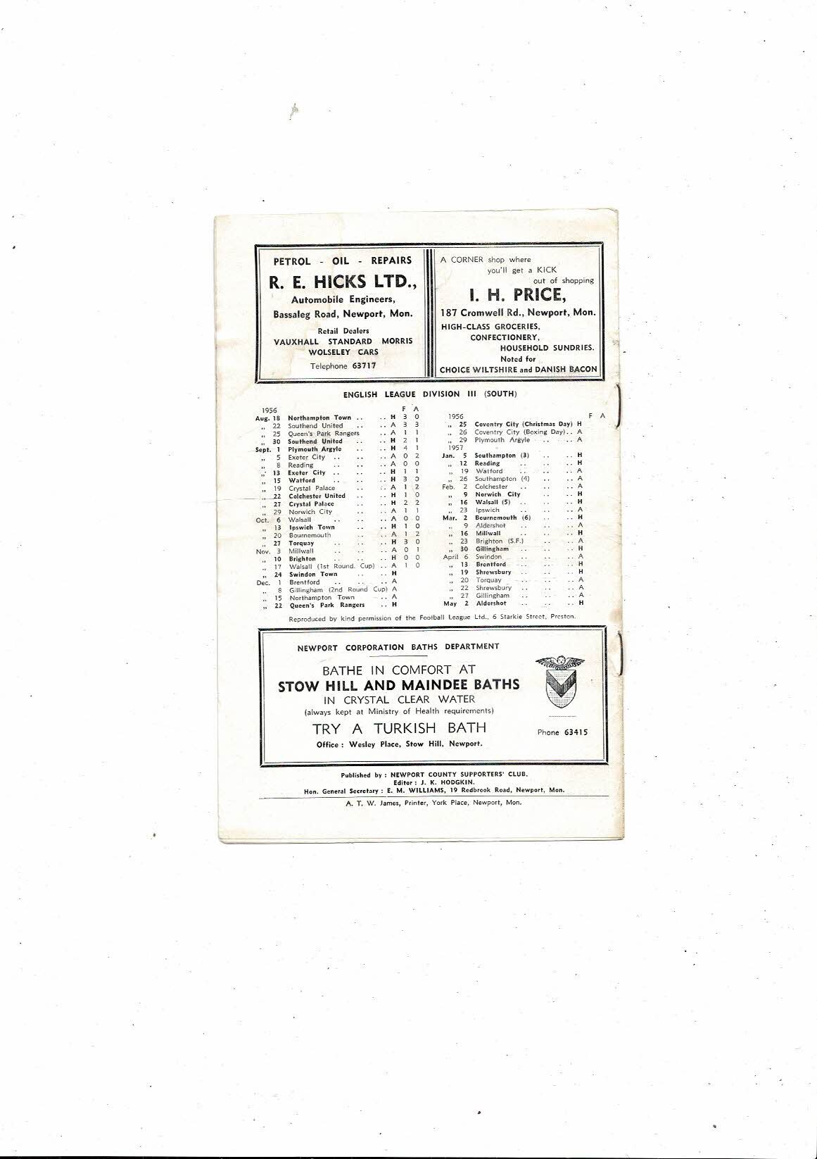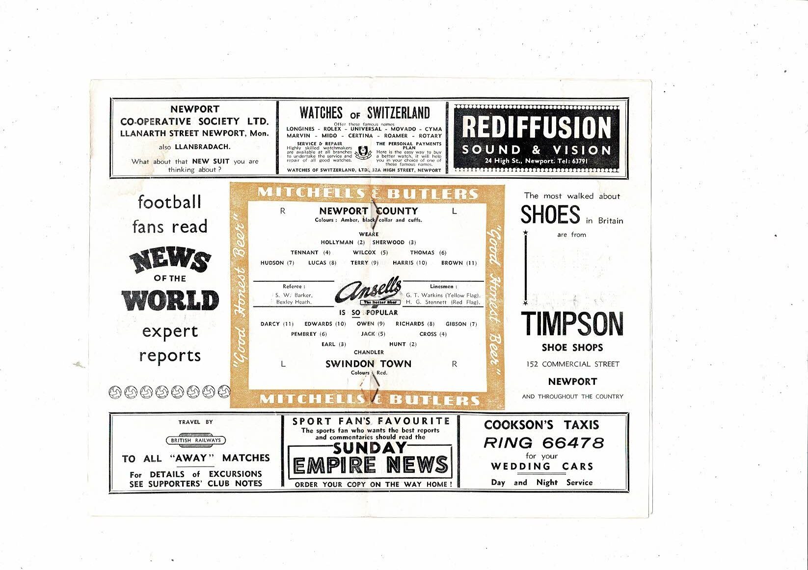 1956/57 Newport County v Swindon Town Football Programme