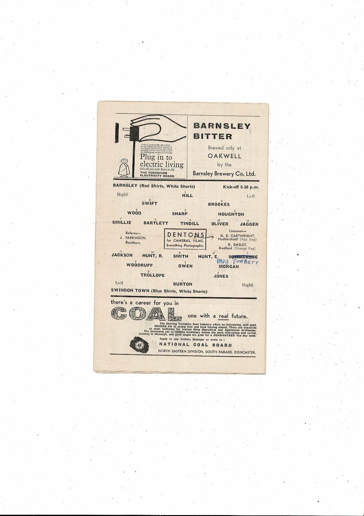 1961/62 Barnsley v Swindon Town Football Programme