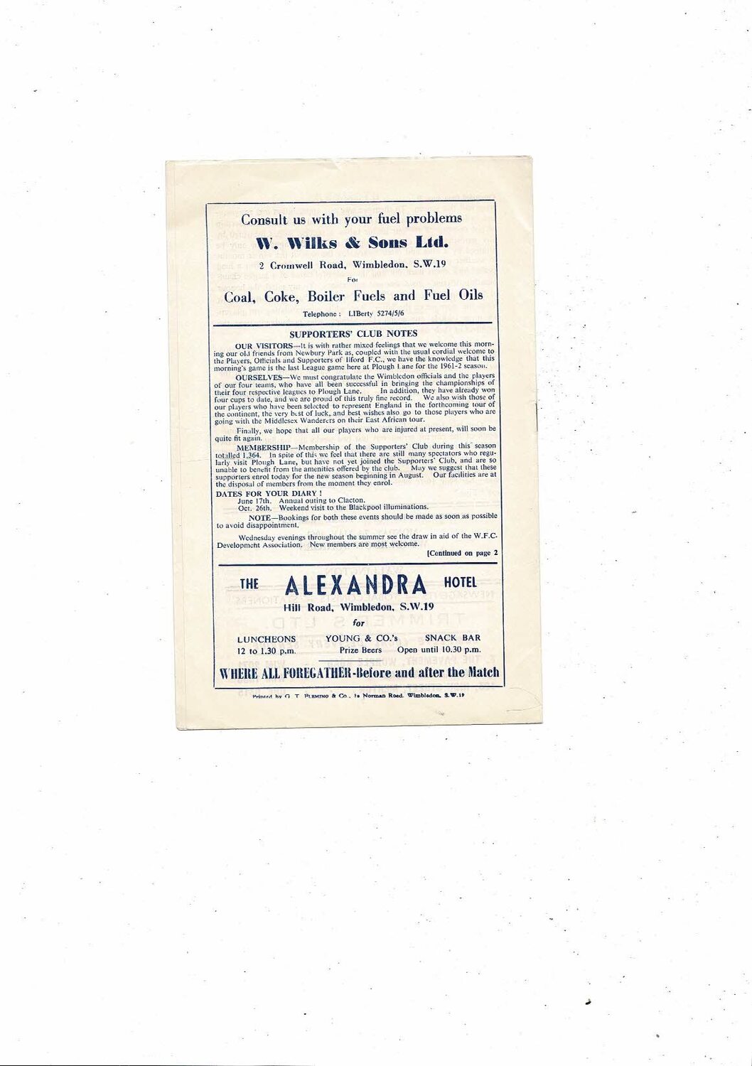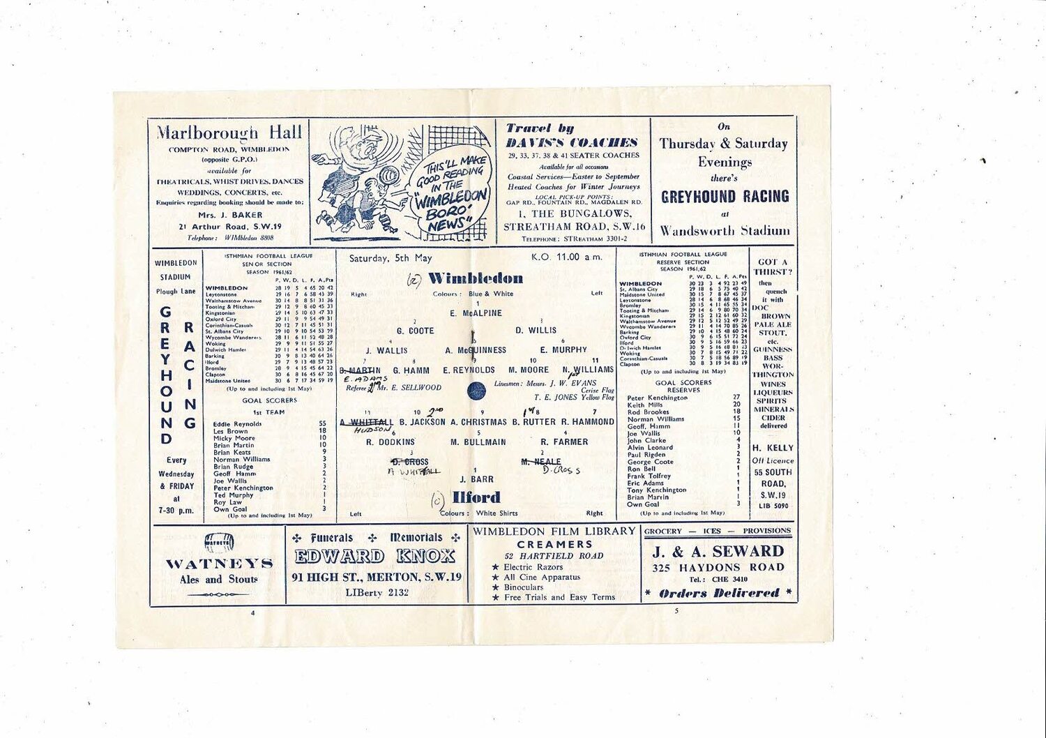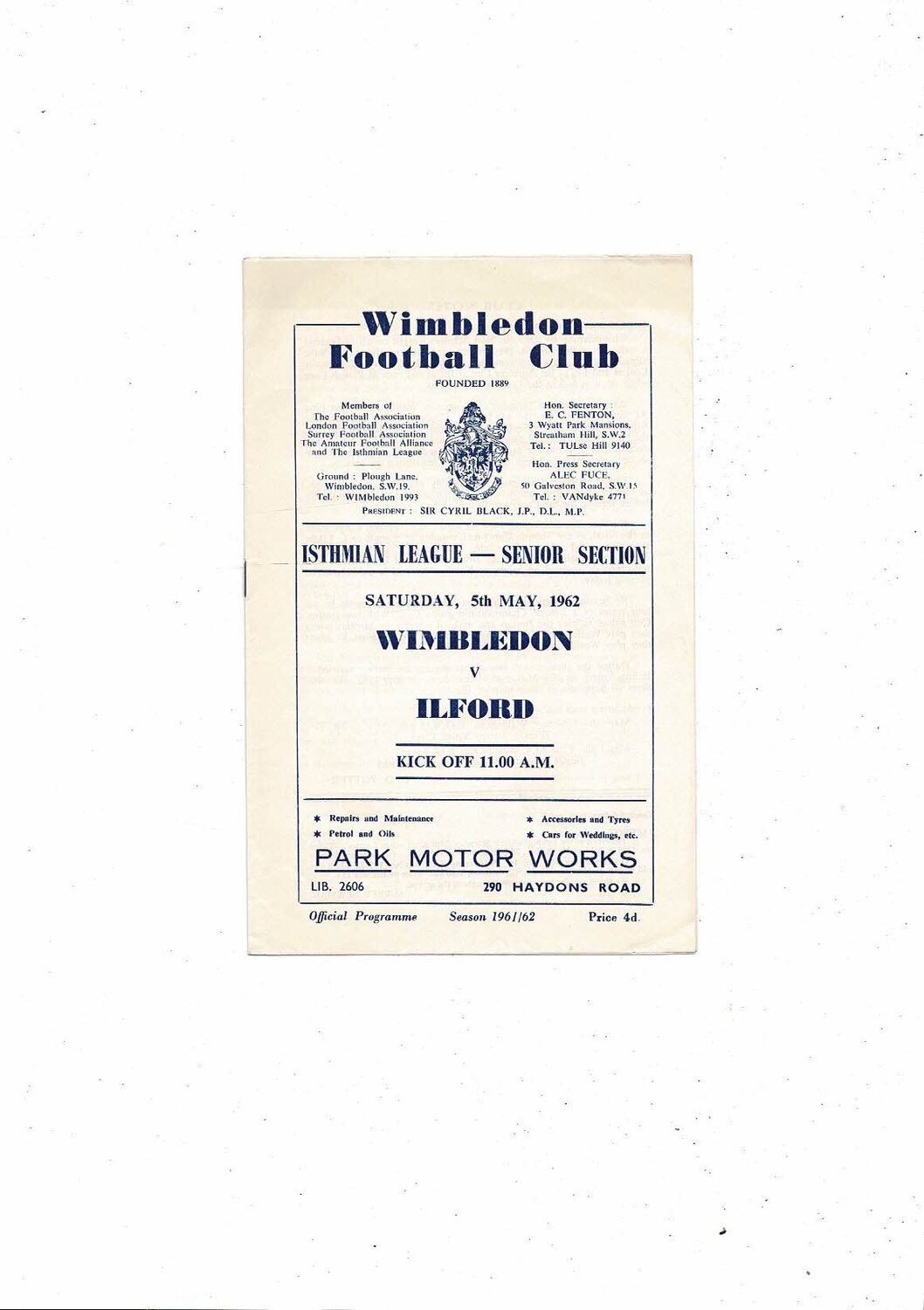 1961/62 Wimbledon v Ilford Isthmian League Football Programme