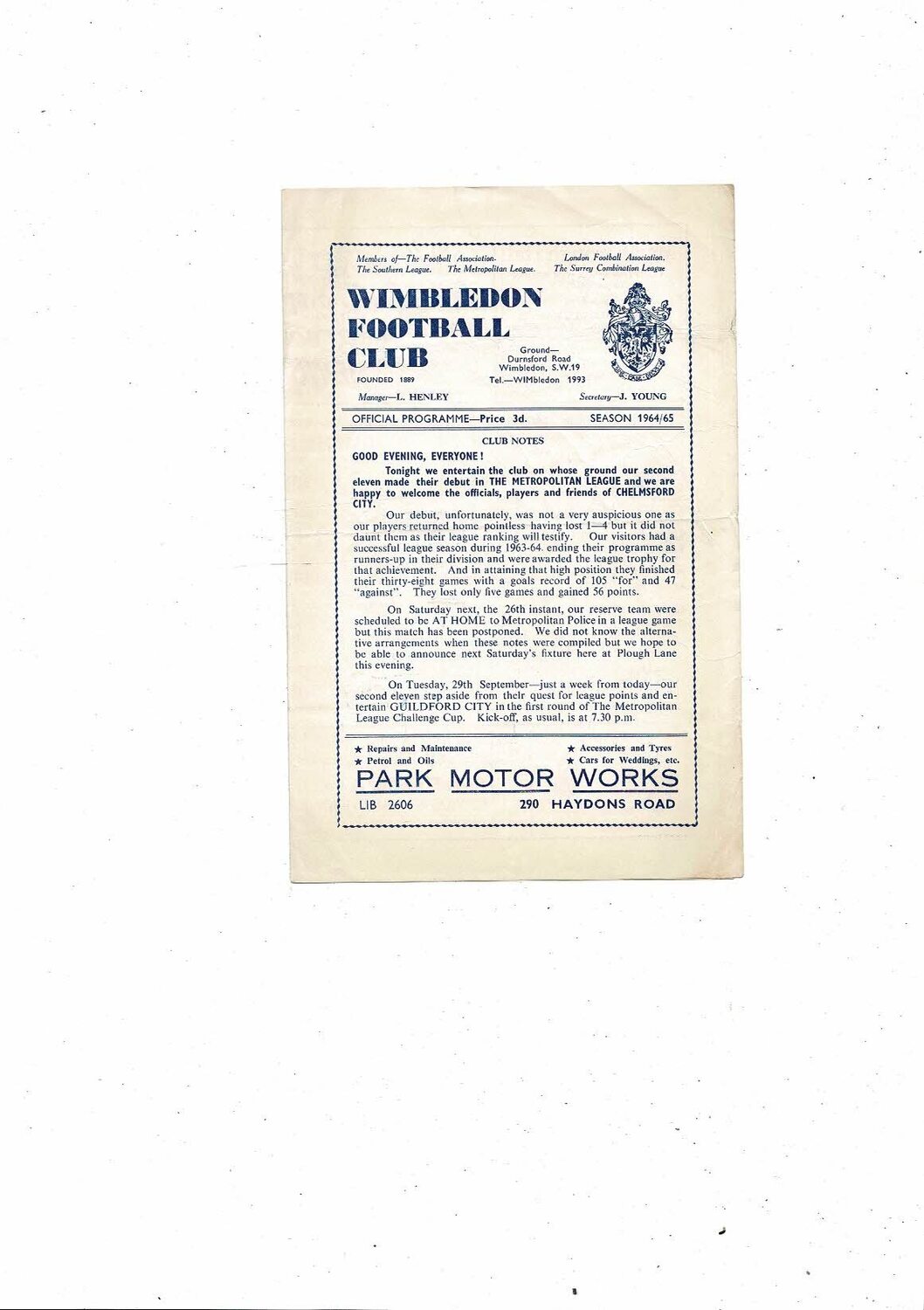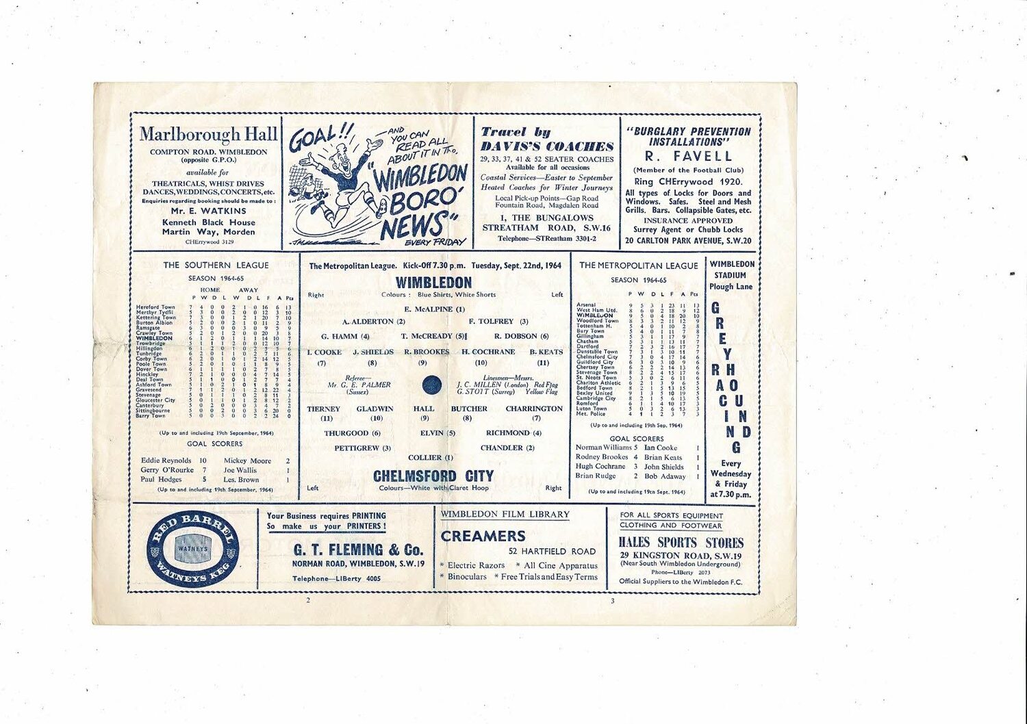 1964/65 Wimbledon v Chelmsford City Metropolitan League Football Programme