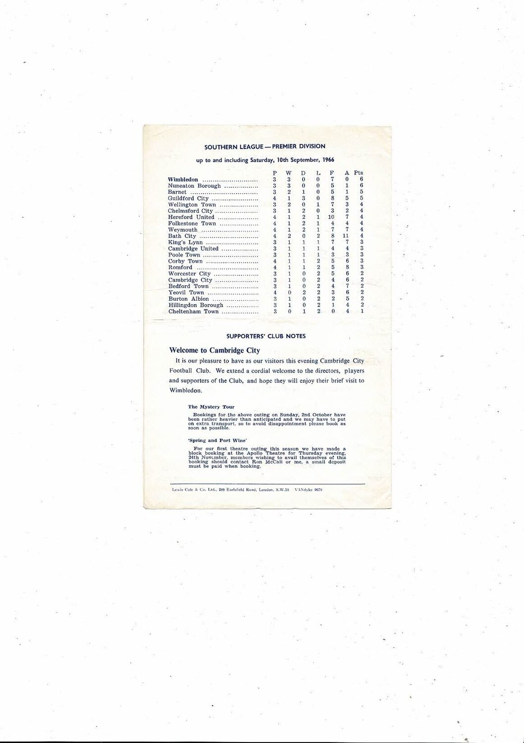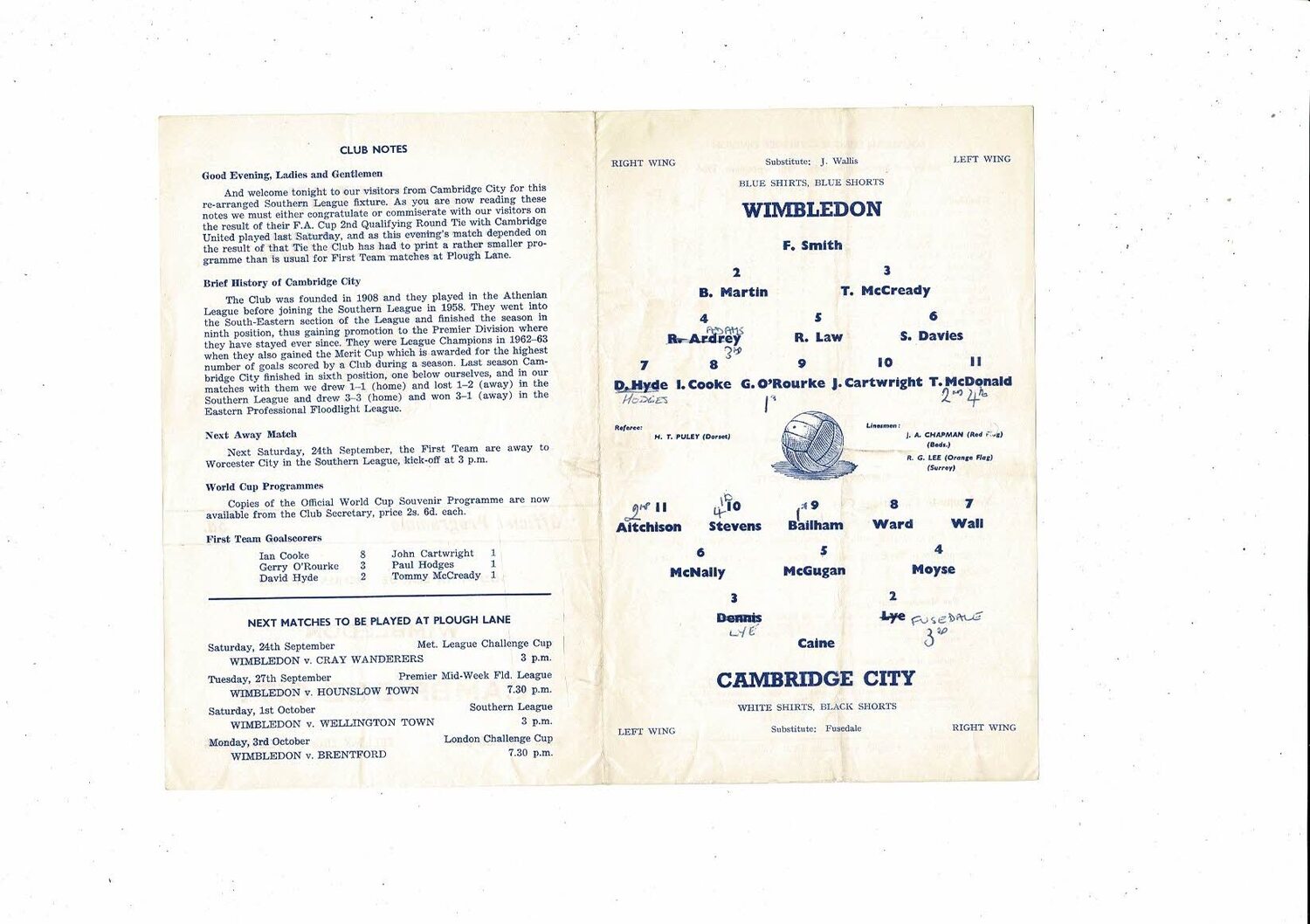 1966/67 Wimbledon v Cambridge City Southern League Football Programme