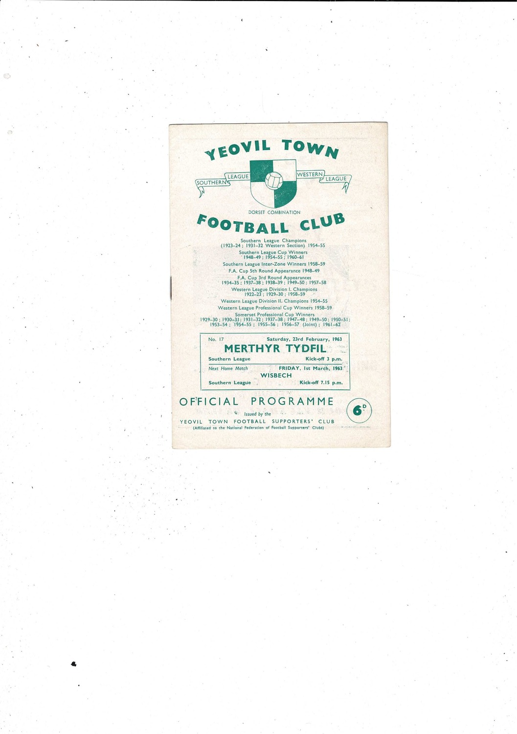 1962/63 Yeovil Town v Merthyr Tydfil Football Programme