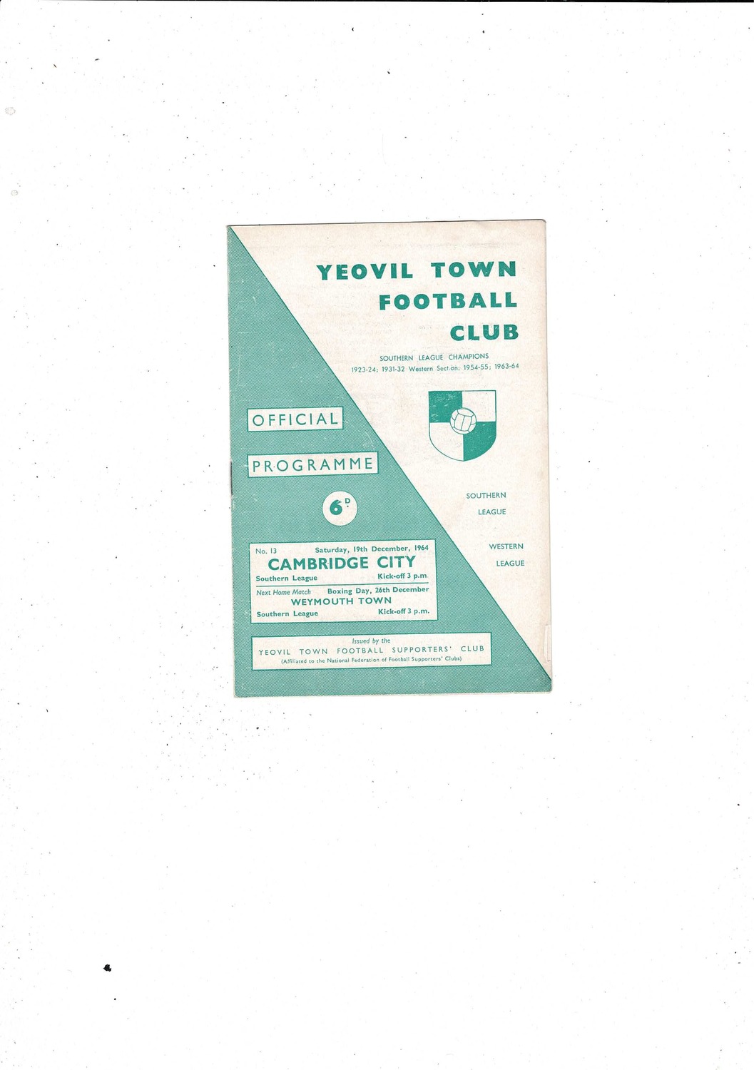 1964/65 Yeovil Town v Cambridge City Football Programme