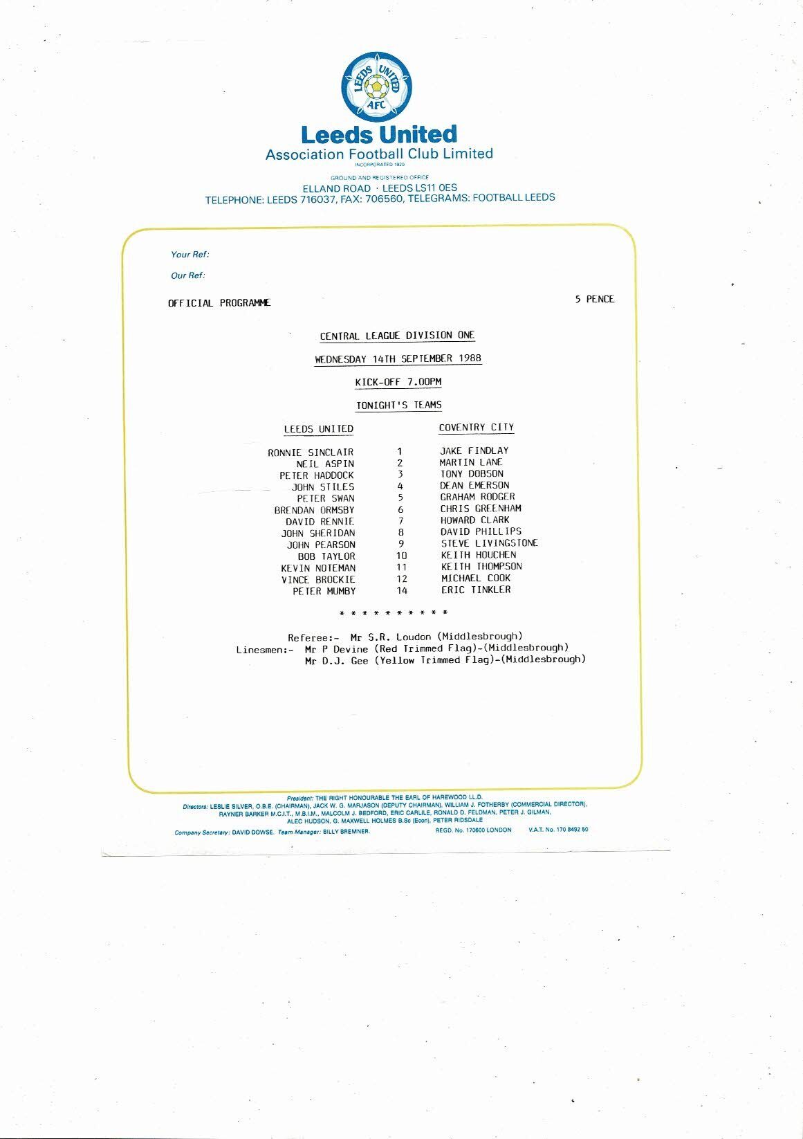 Leeds United v Coventry City Central League Football Programme 1988/89