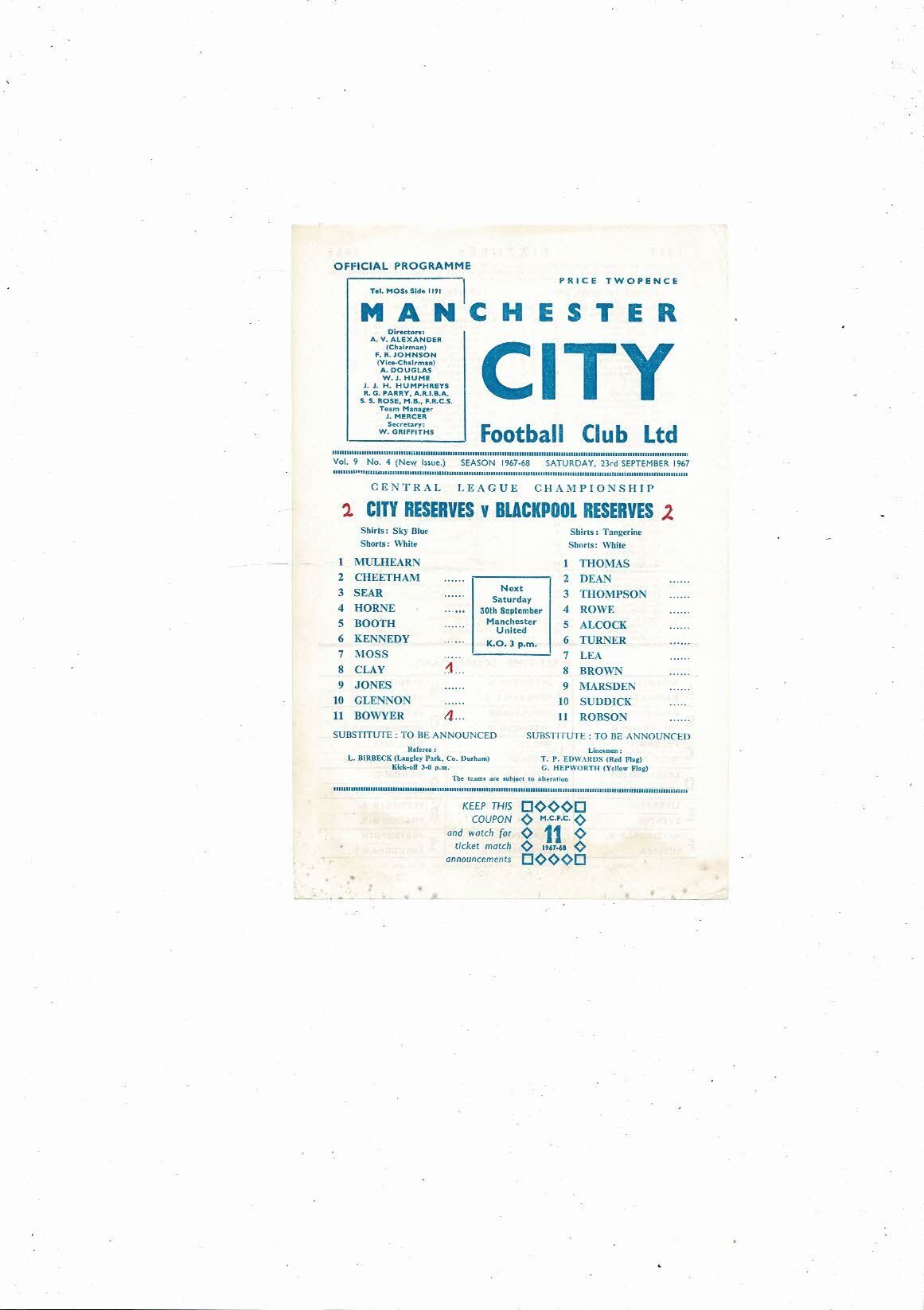 Manchester City v Blackpool Central League Football Programme 1967/68