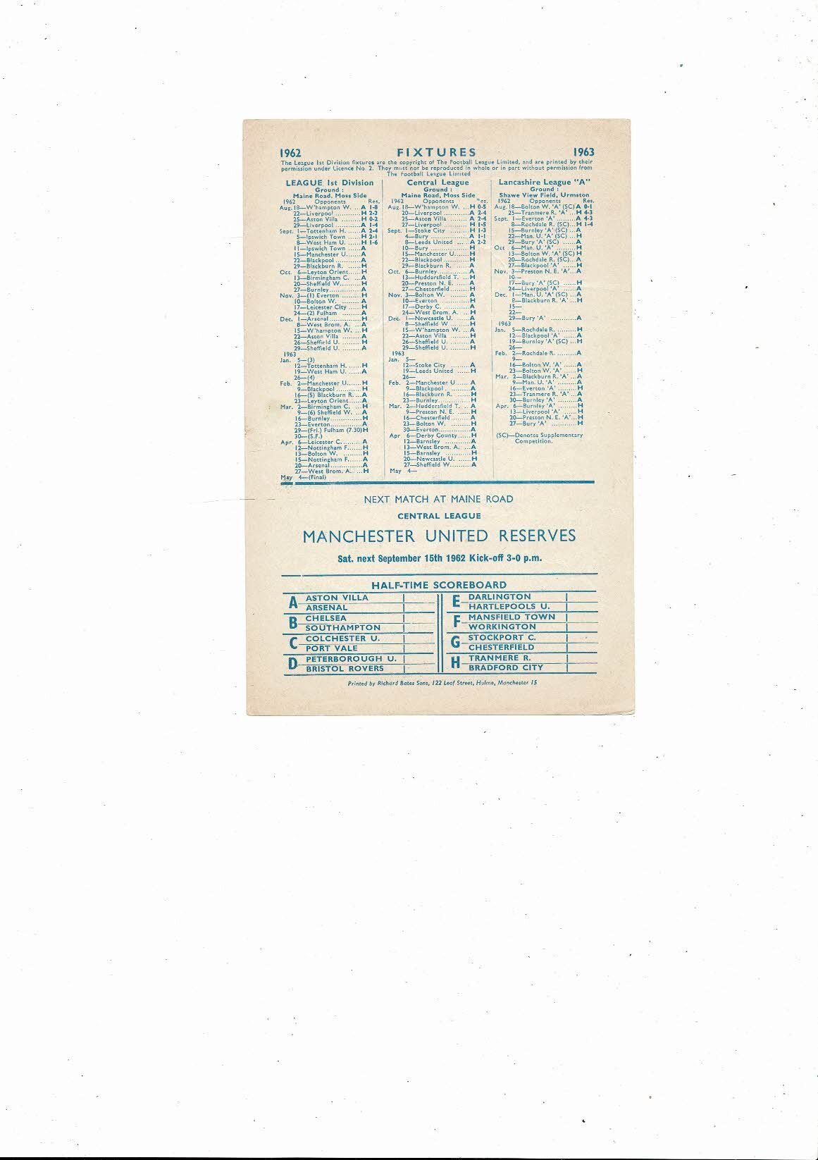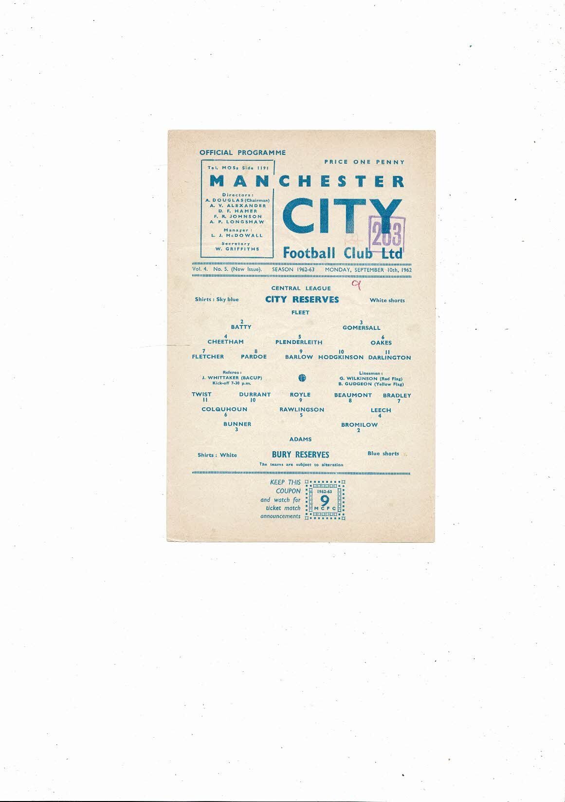 Manchester City v Bury Central League Football Programme 1962/63