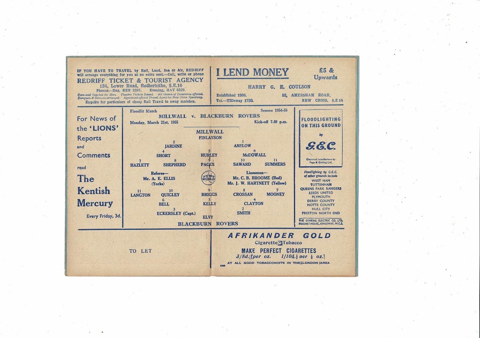 Millwall v Blackburn Rovers Friendly Football Programme 1954/55
