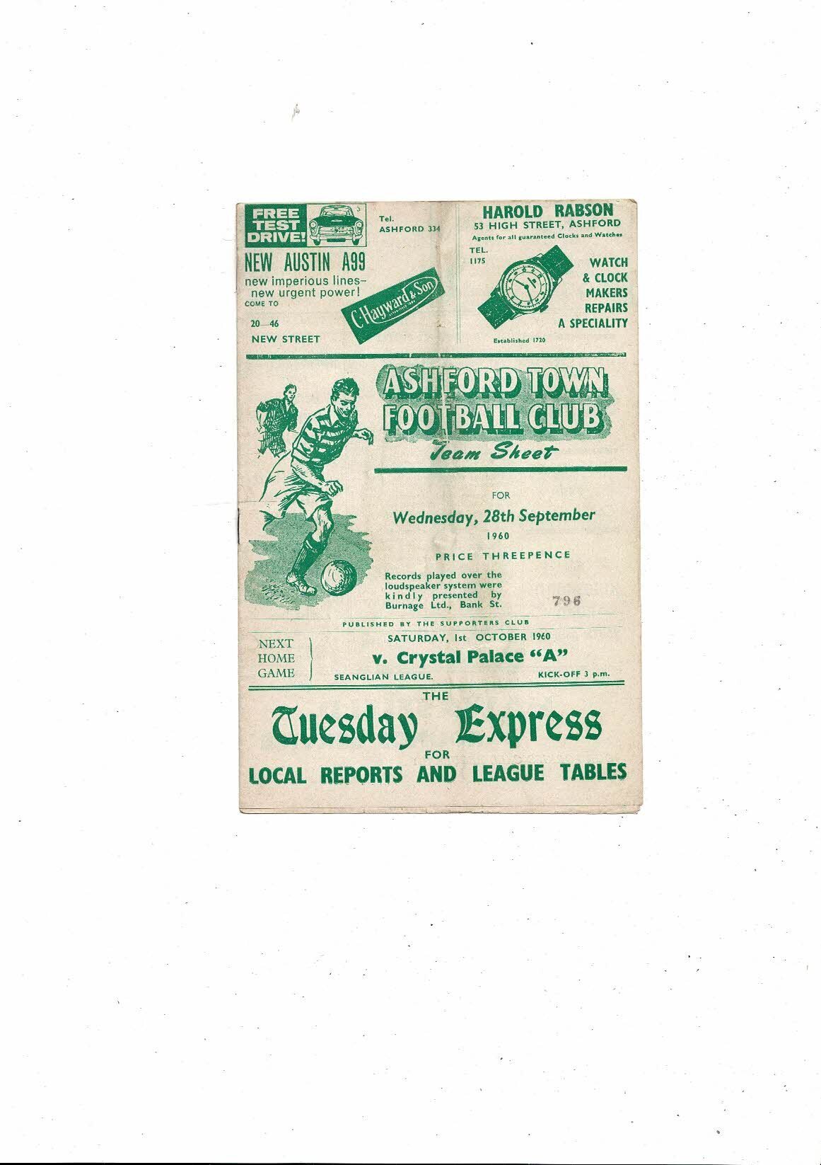 1960/61 Ashford Town v Nuneaton Borough Southern League Football Programme