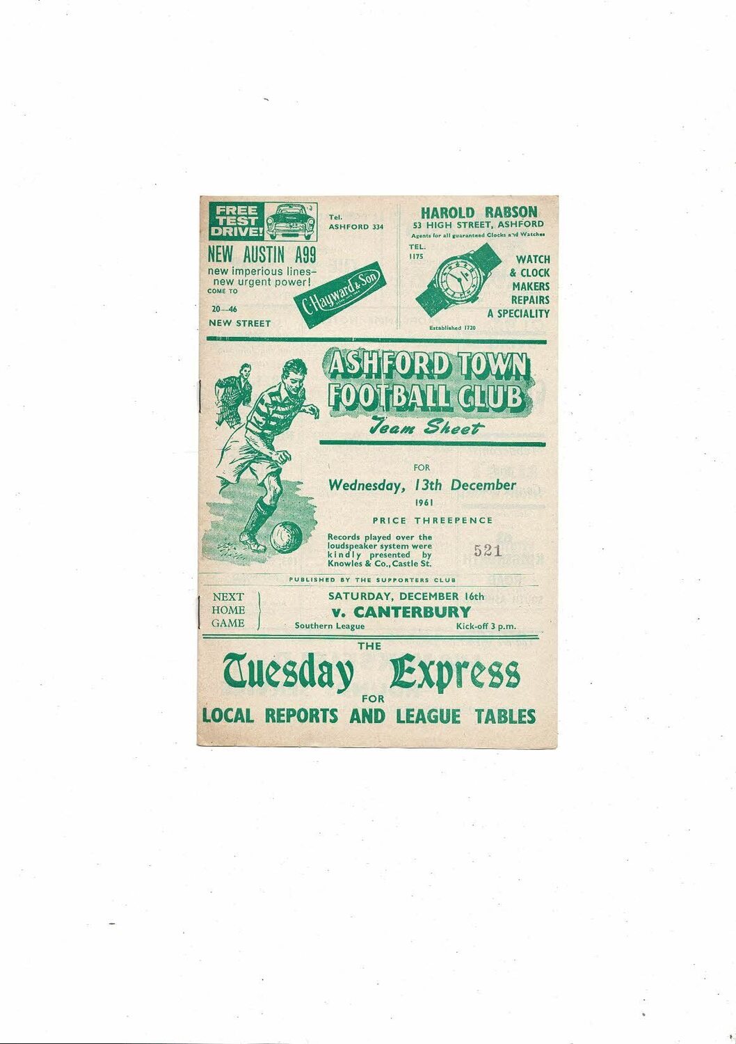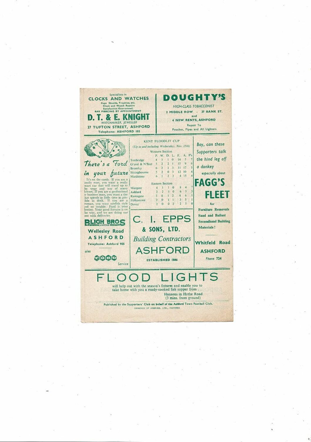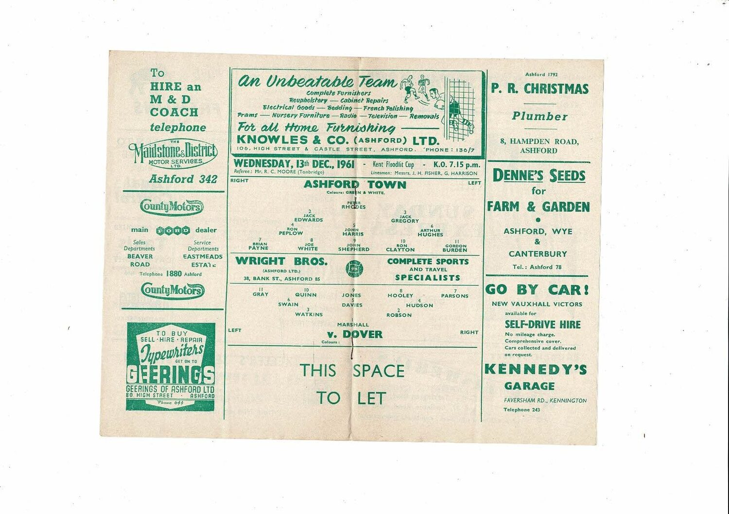 1961/62 Ashford Town v Dover Kent Floodlit Cup Football Programme