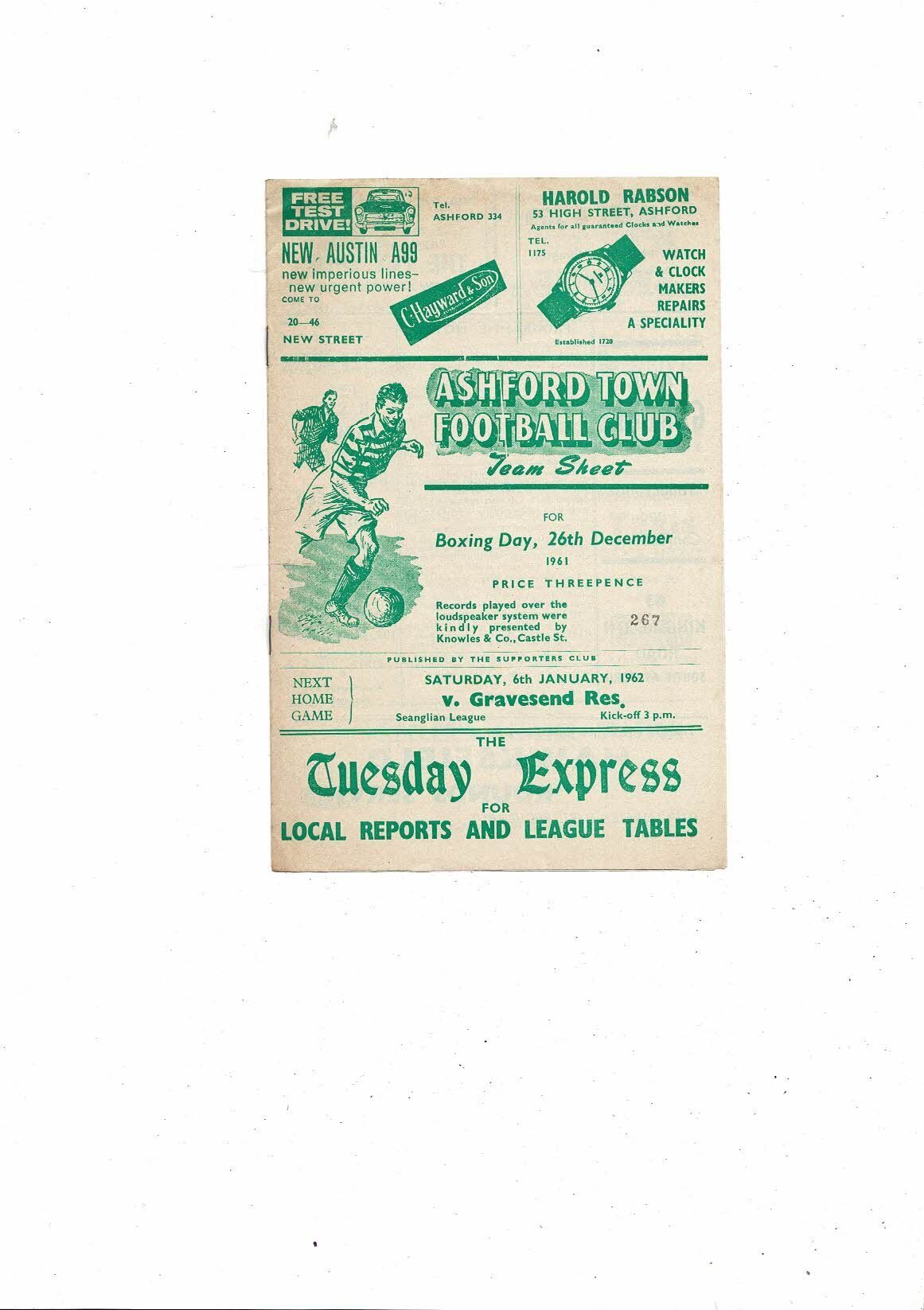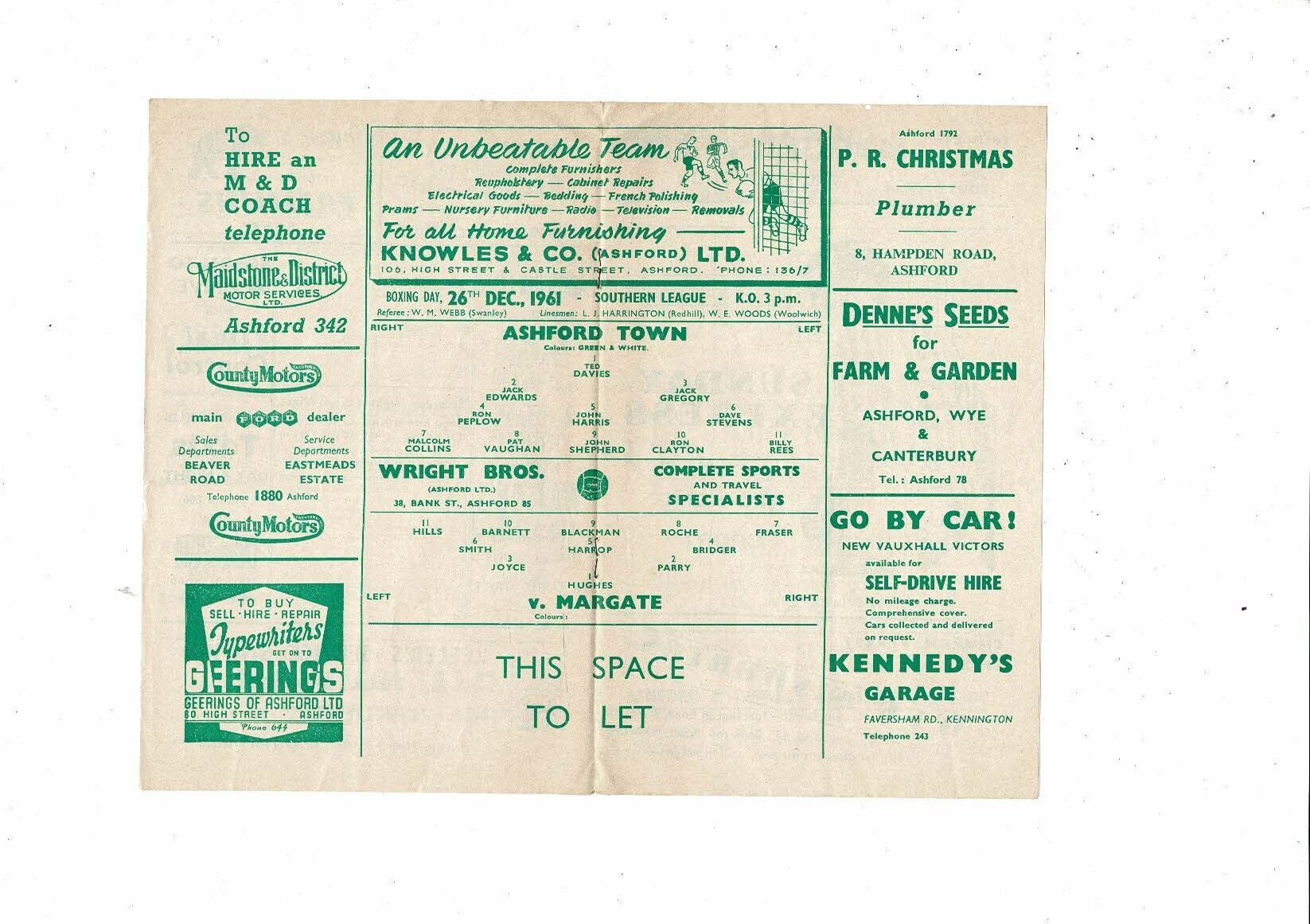 1961/62 Ashford Town v Margate Southern League Football Programme
