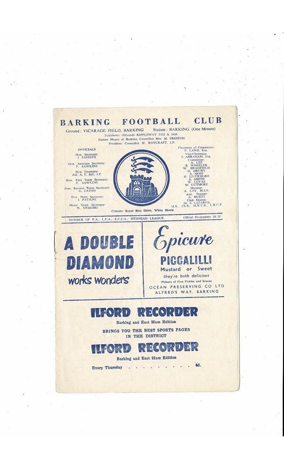 1960/61 Barking v Bedford Town East Anglian Cup Football Programme