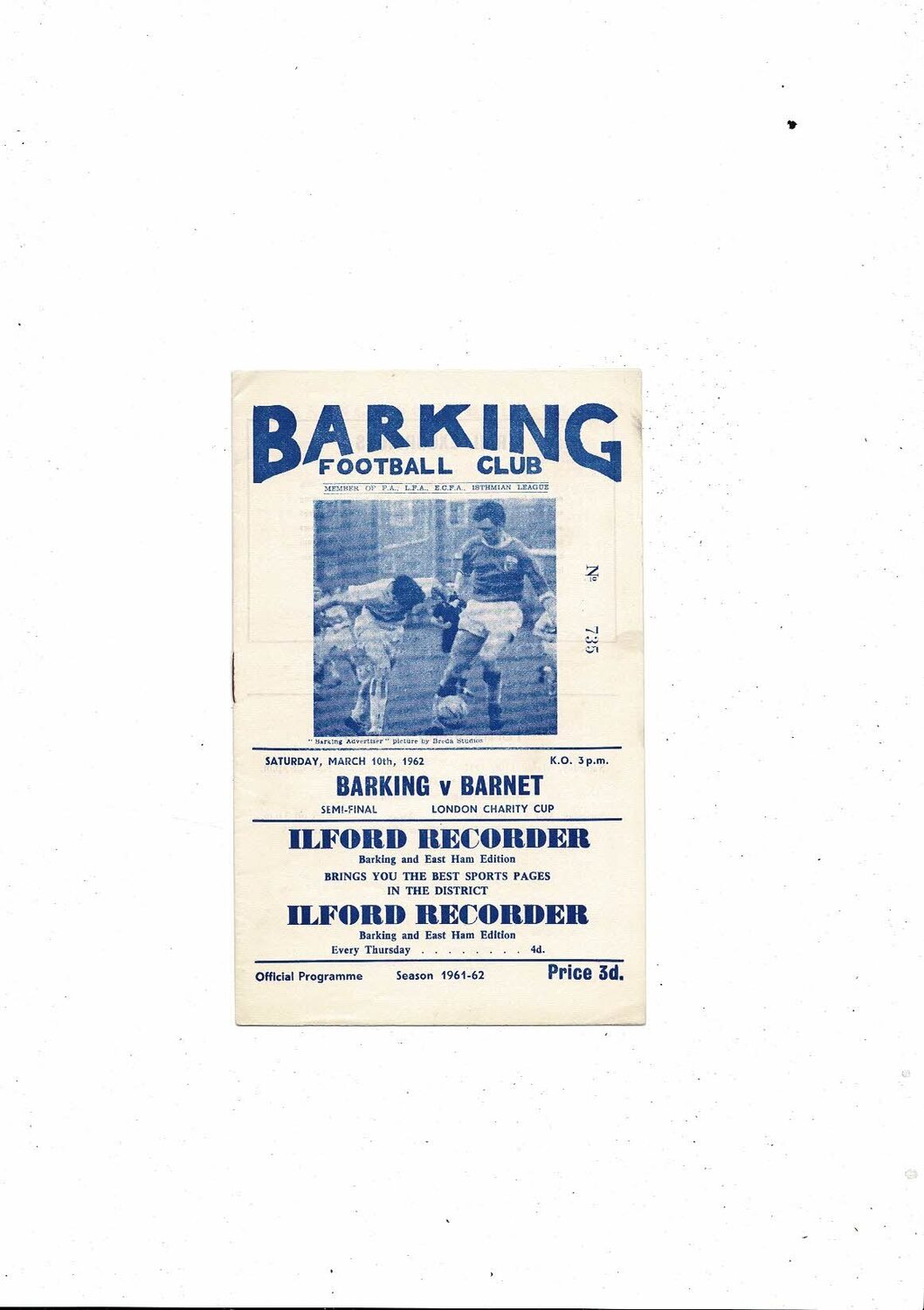 1961/62 Barking v Barnet London Charity Cup Semi Final Football Programme