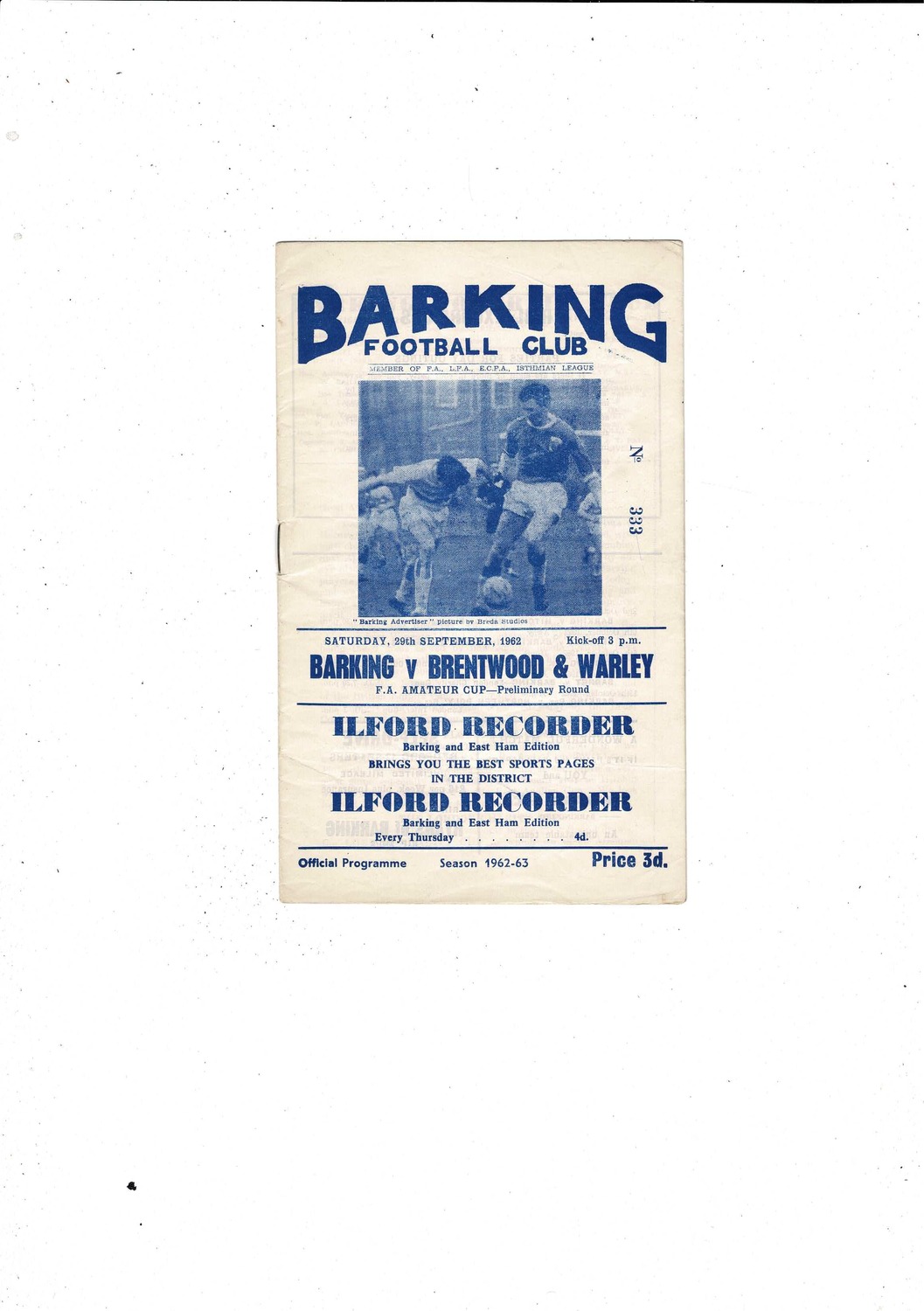1962/63 Barking v Brentwood & Warley Amateur Cup Football Programme