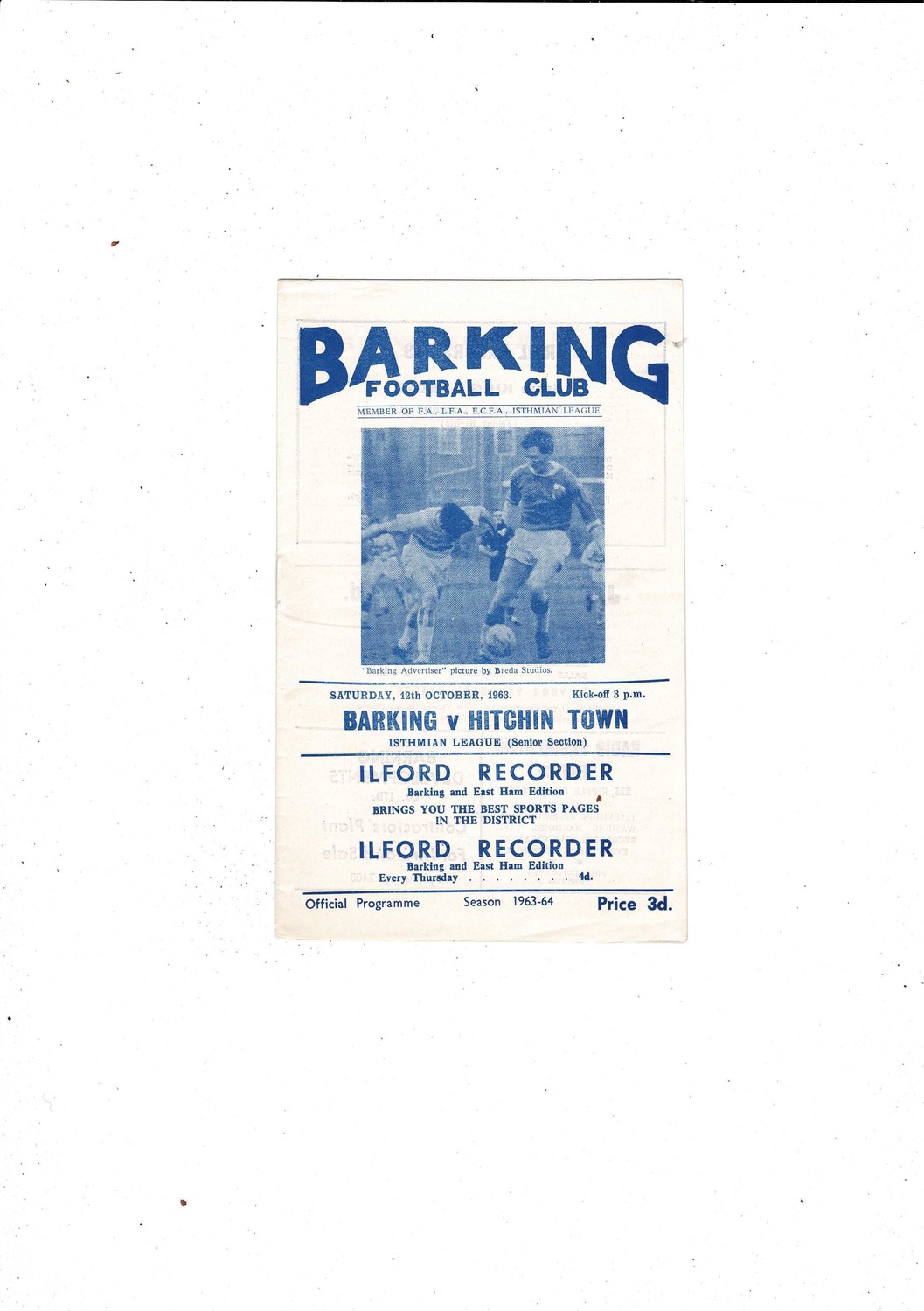 1963/64 Barking v Hitchin Town Football Programme