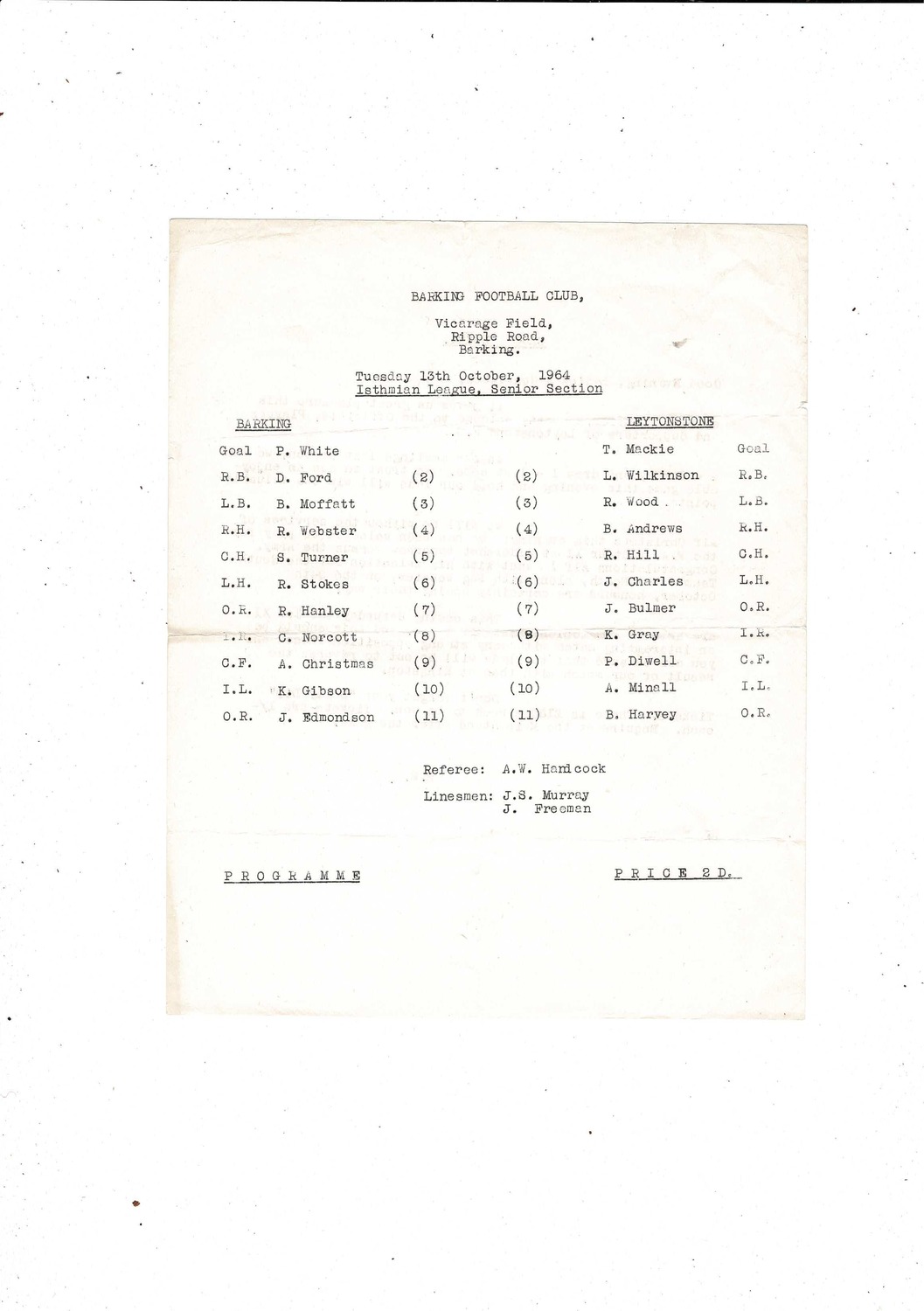 1964/65 Barking v Leytonstone Football Programme