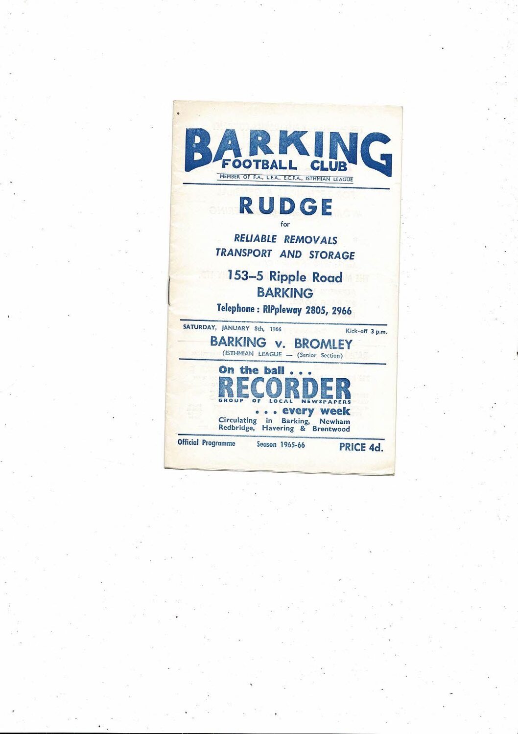 1965/66 Barking v Bromley Football Programme