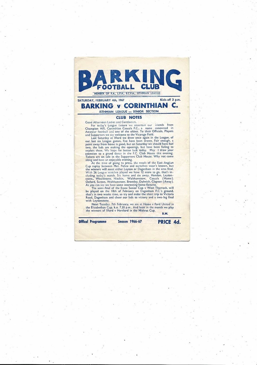 1966/67 Barking v Corinthian Casuals Football Programme