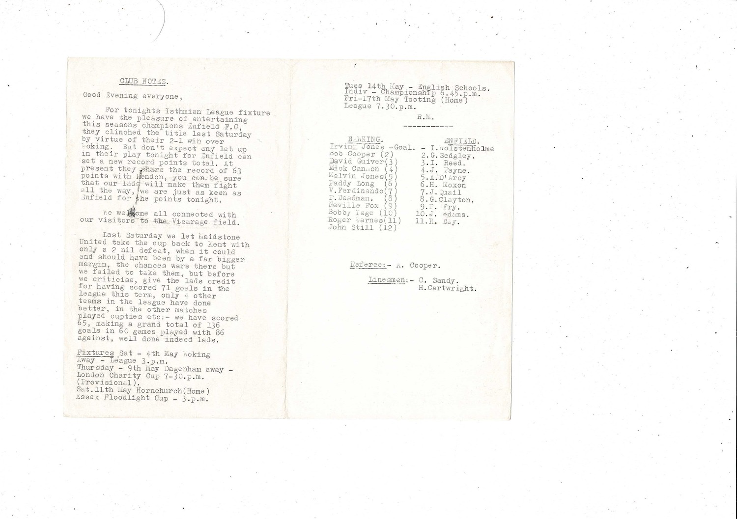 1967/68 Barking v Enfield Football Programme