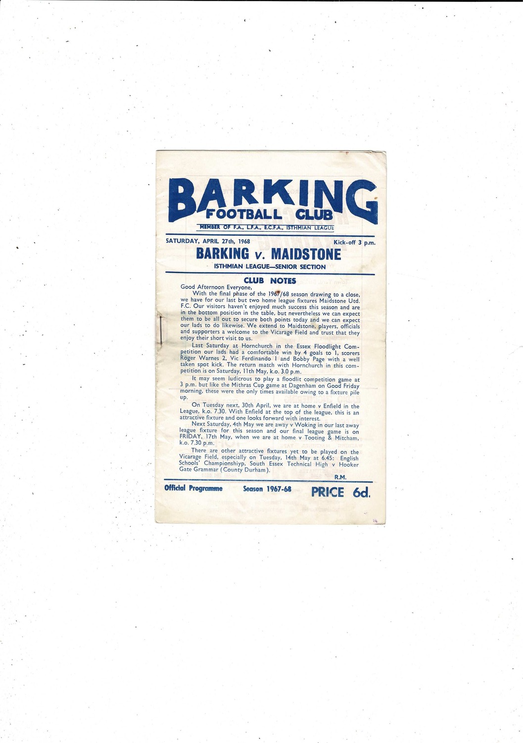 1967/68 Barking v Maidstone Football Programme