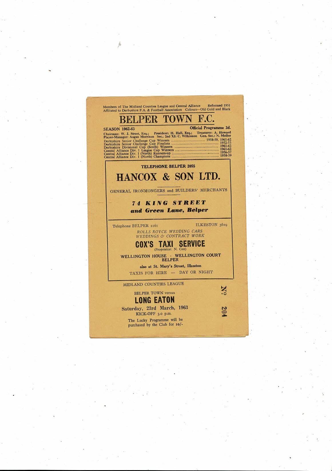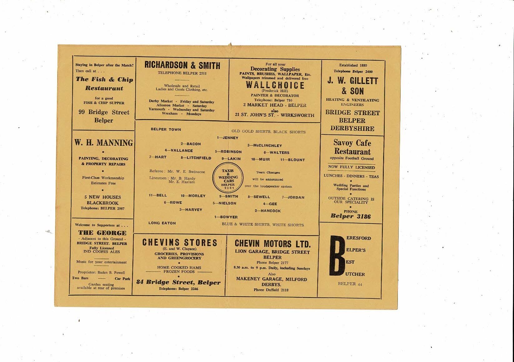 1962/63 Belper Town v Long Eaton Midland Counties League Football Programme