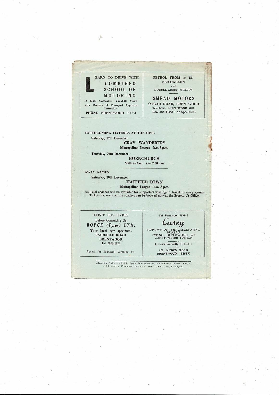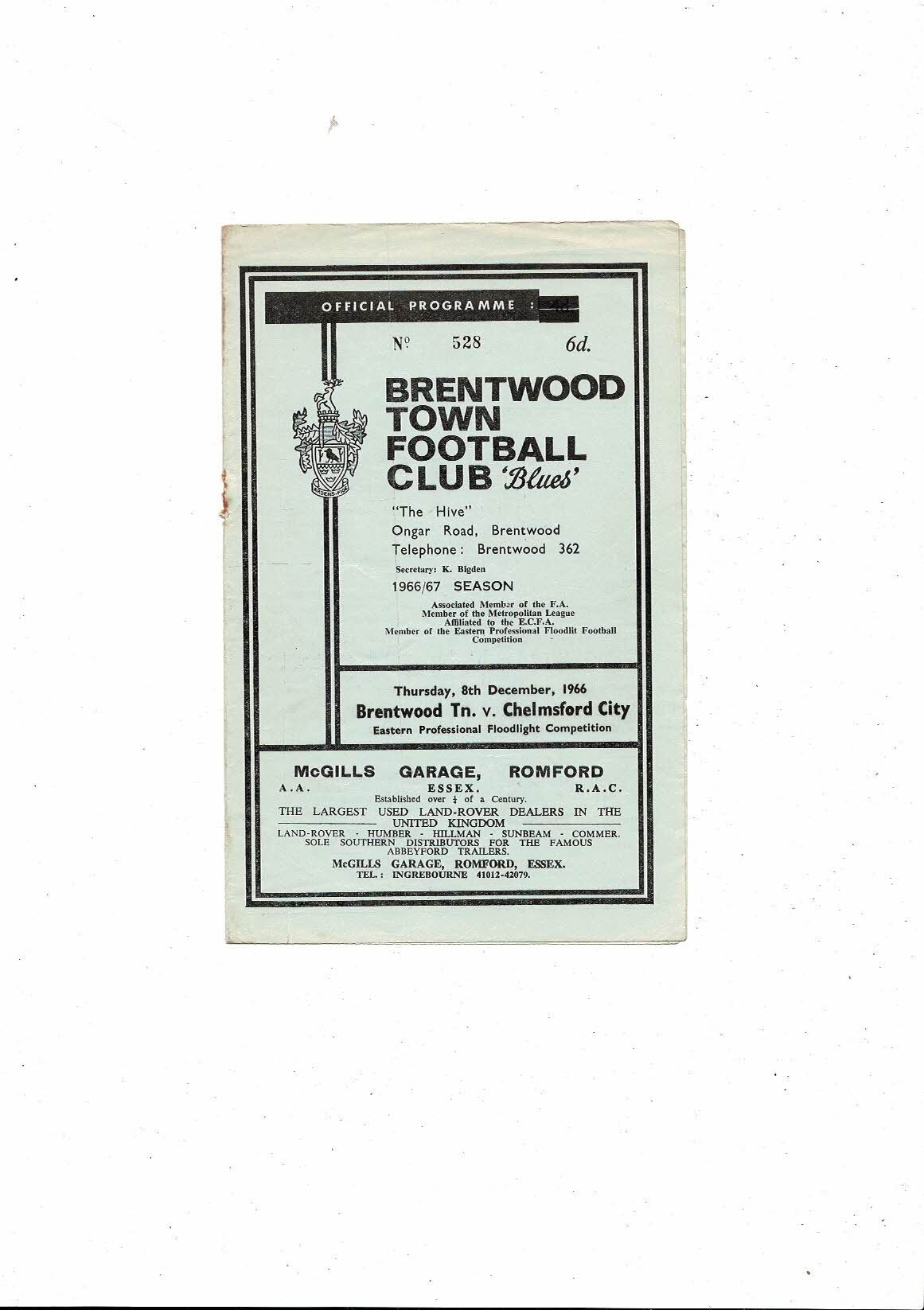 1966/67 Brentwood Town v Chelmsford City Eastern Floodlight Competition Football Programme
