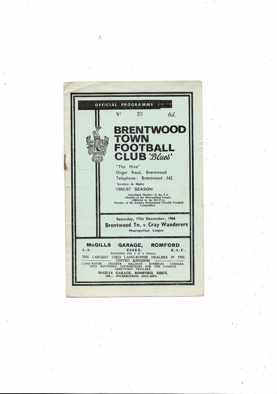 1966/67 Brentwood Town v Cray Wanderers Football Programme