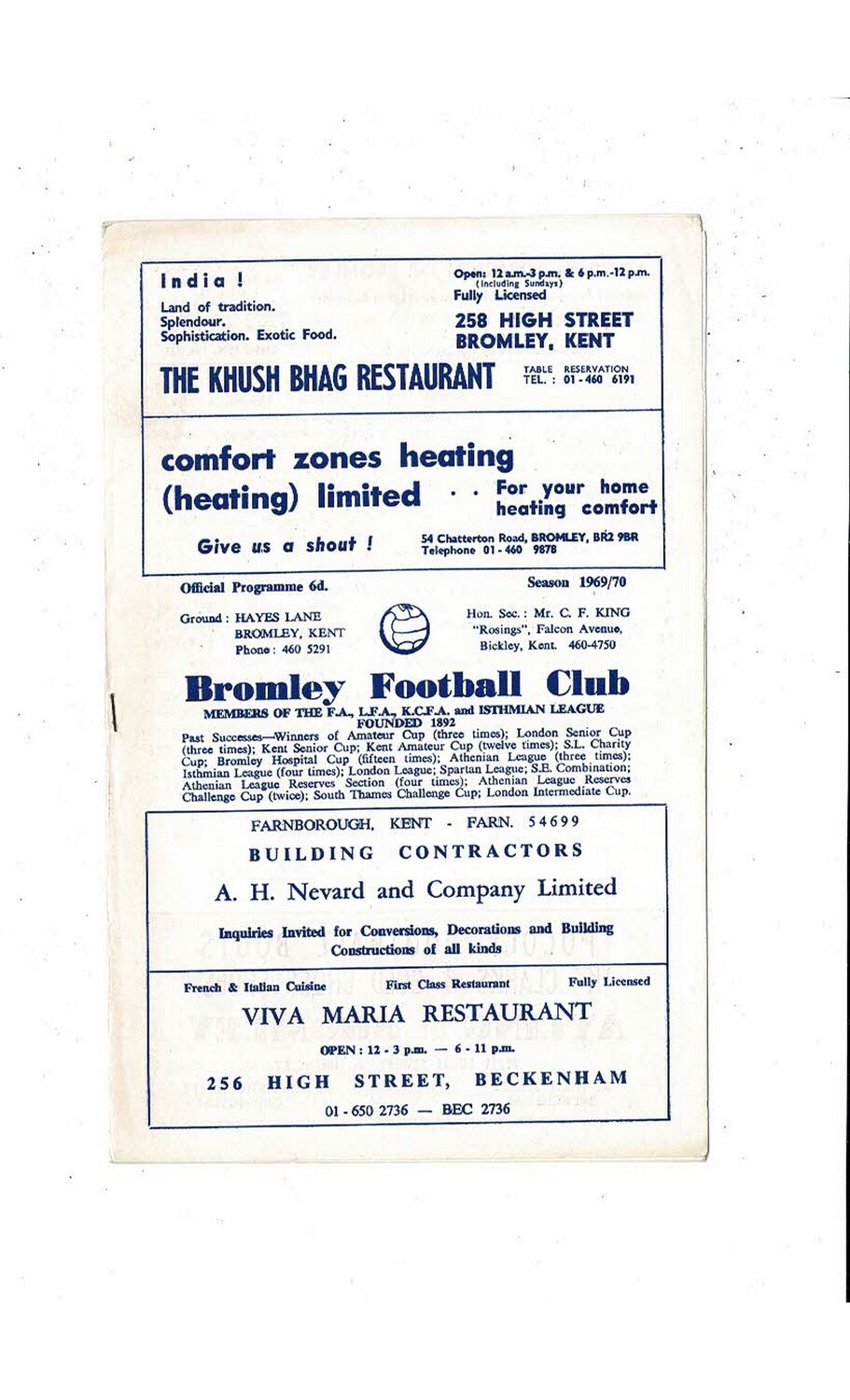 1969/70 Bromley v Bexley United Football Programme