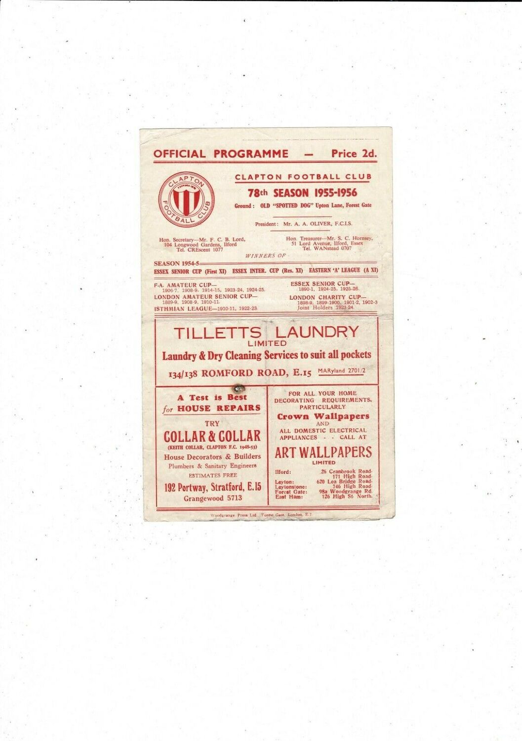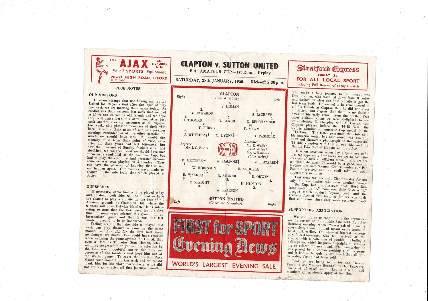 1955/56 Clapton v Sutton United FA Amateur Cup Football Programme