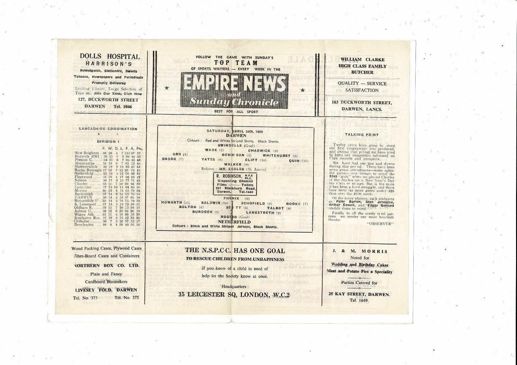 1958/59 Darwen v Netherfield Football Programme