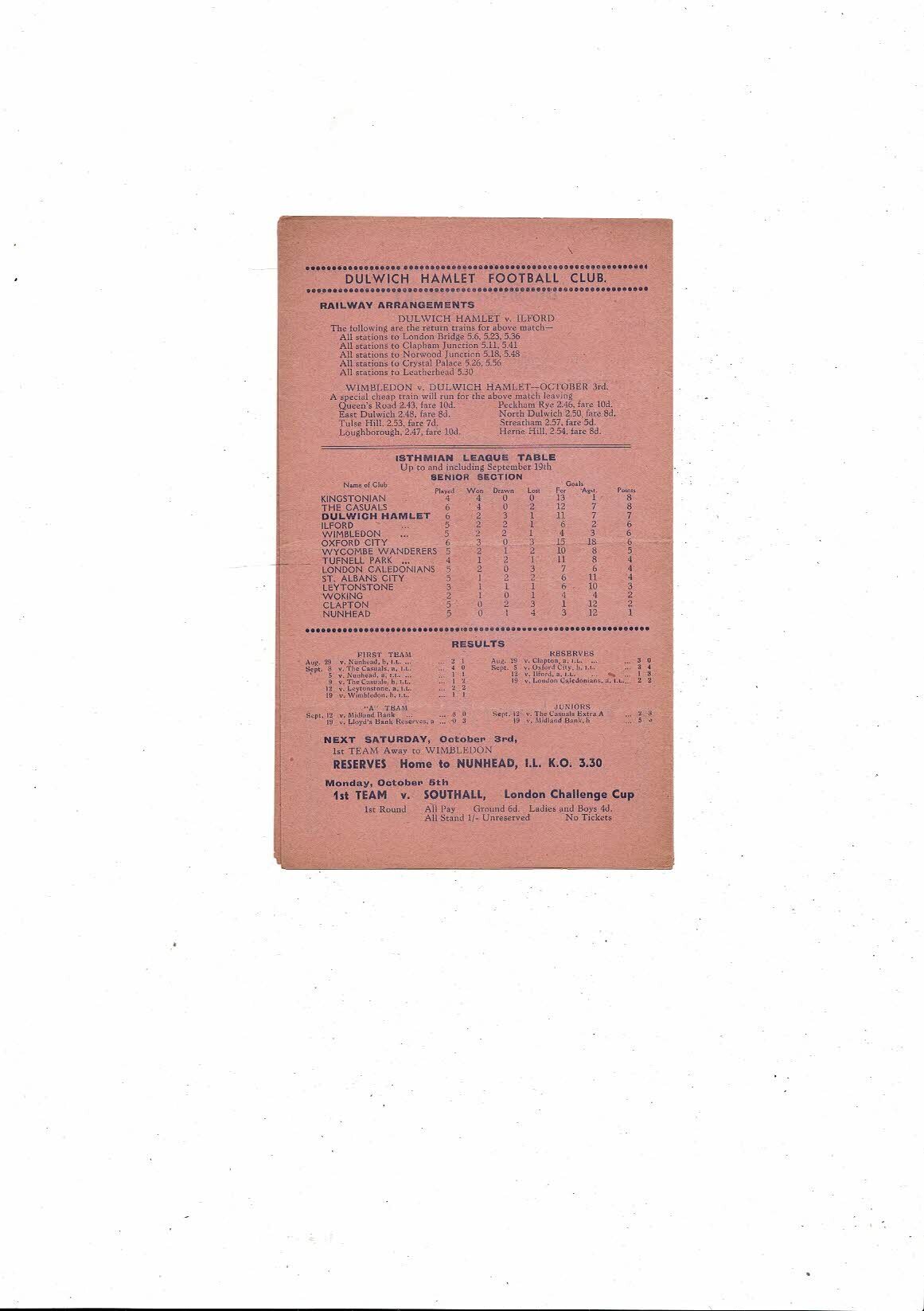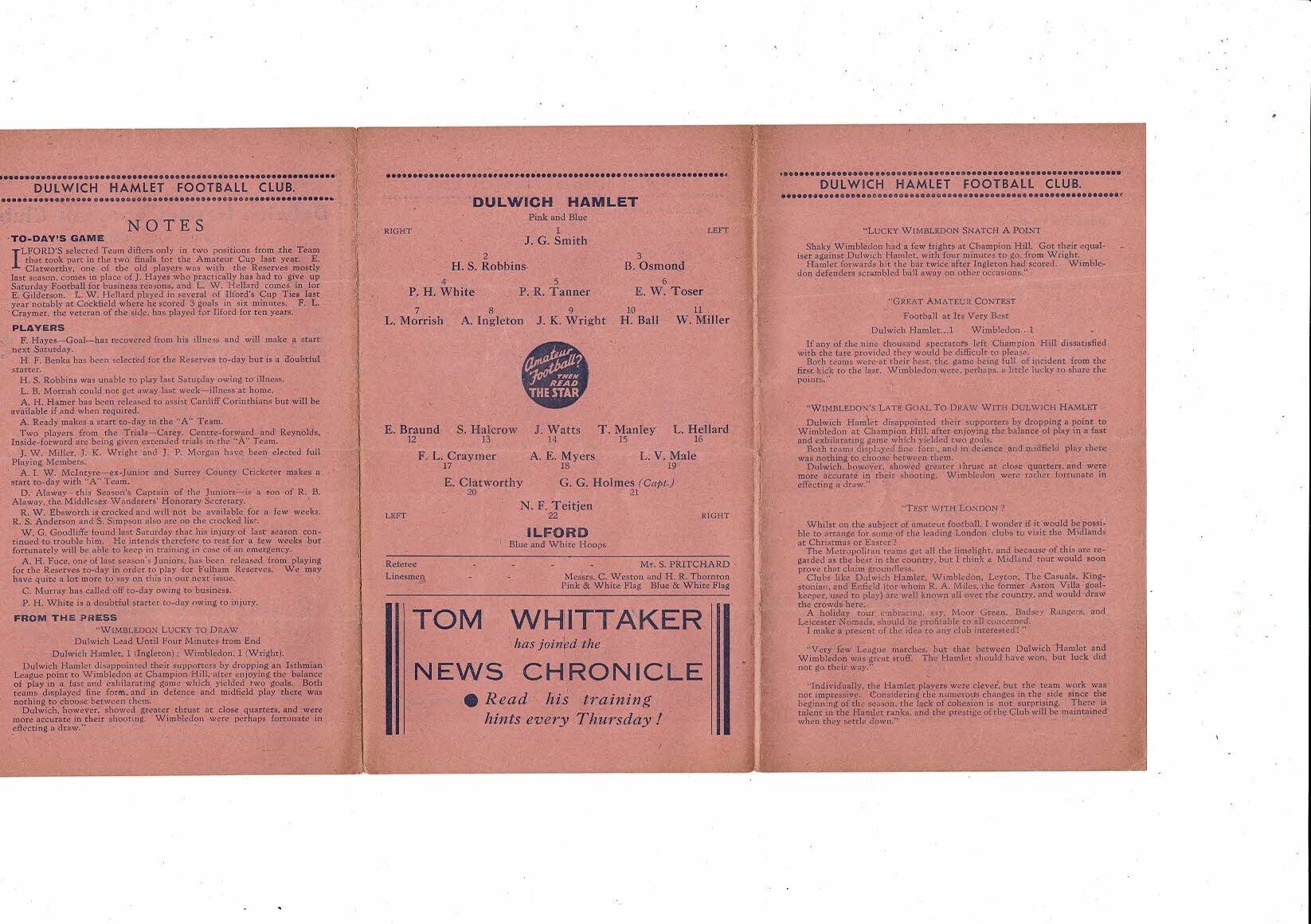 1936/37 Dulwich Hamlet v Ilford London Charity Cup Football Programme
