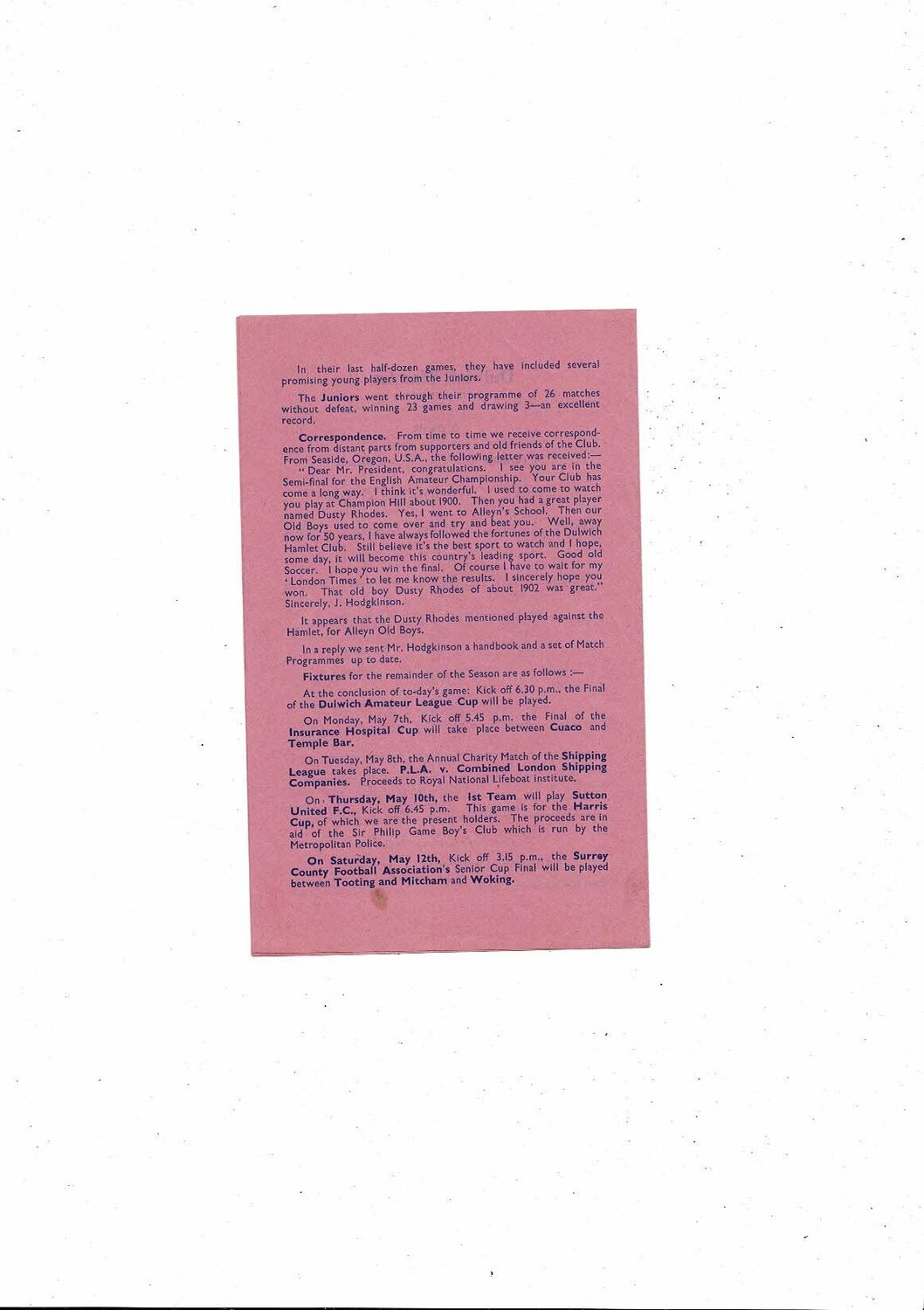 This Original 4 page Football Programme is slightly creased with a minor stain on back. No handwriting