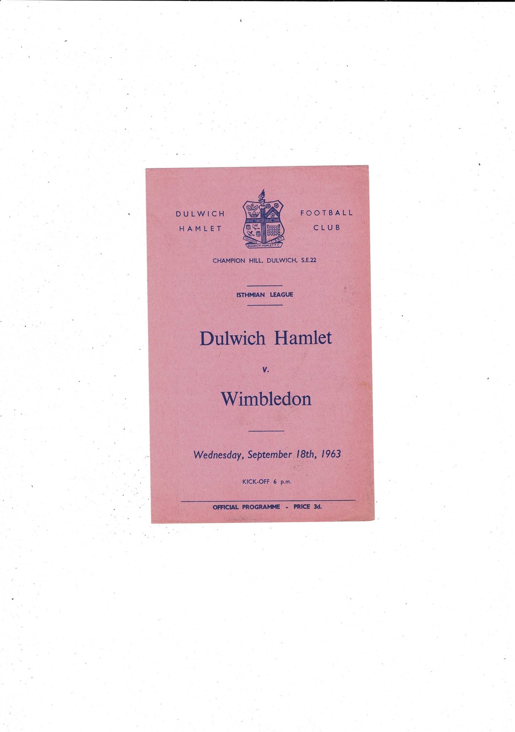 1963/64 Dulwich Hamlet v Wimbledon Football Programme